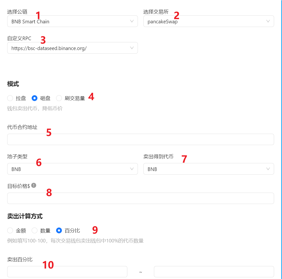 - 百分比:每个钱包每次按照一定百分比卖出代币