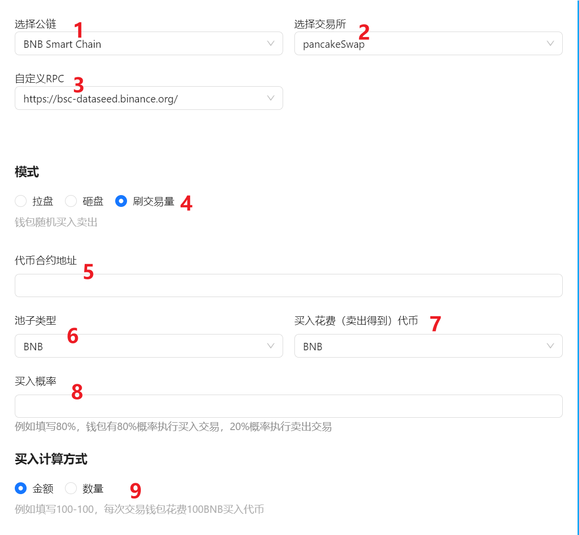 如果第9步选择的是金额,这里就直接输入交易金额。(例如第7步选择的买入花费(卖出得到)代币是USDT,那么数字1就代表1U。若花费代币是BNB,数字1就代表1个BNB)