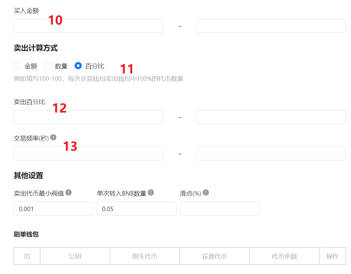 - 百分比:每个钱包每次按照一定百分比卖出代币