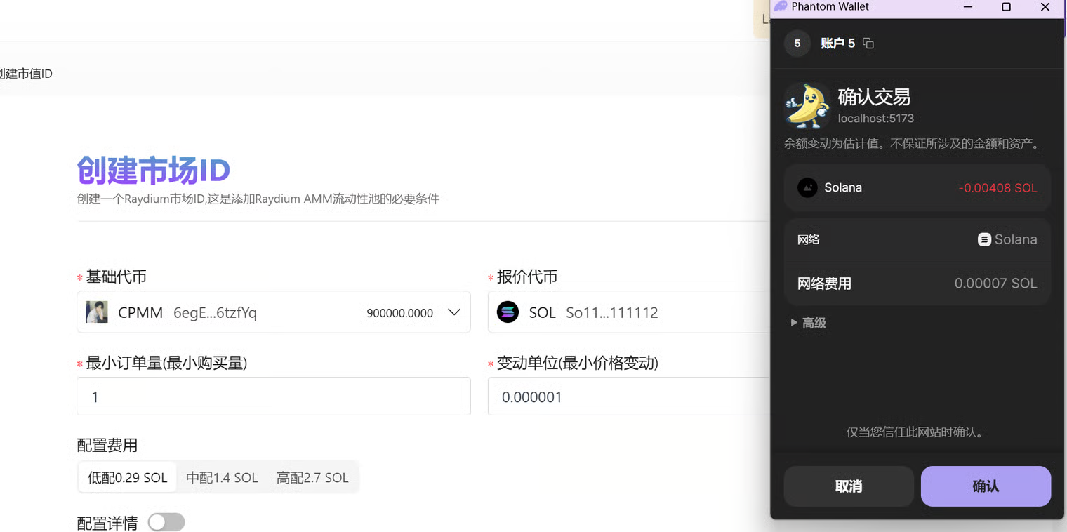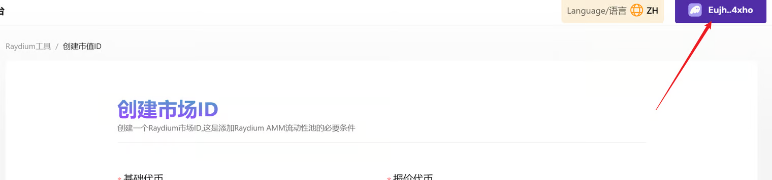 首先打开创建市场ID页面,https://sol.bananatool.org/raydium/createId,右上角连接钱包