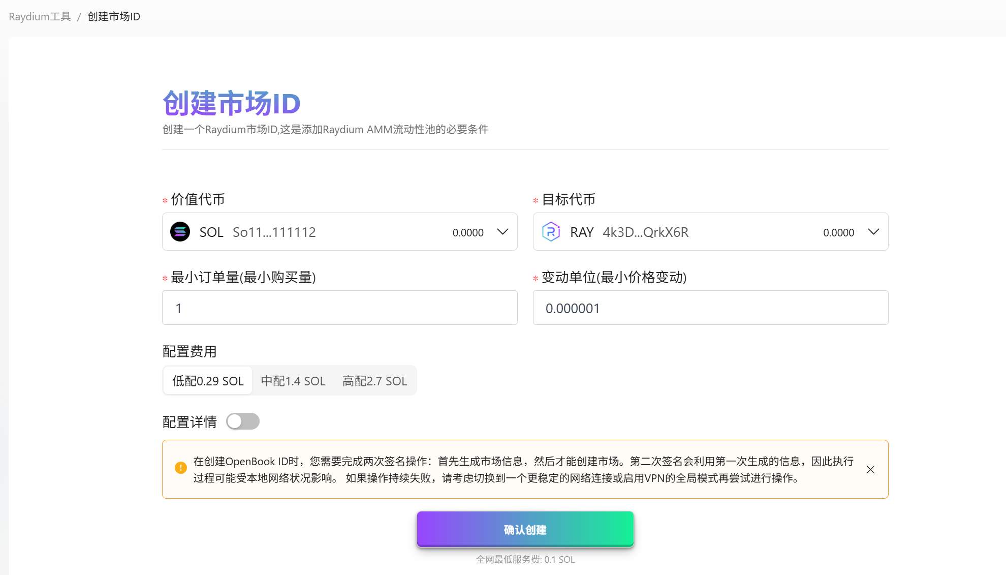 Raydium上线代币市场之前,需要创建OpenBook ID,但是Raydium官方提供的链接创建需要花费 3-4 SOL。这成本使得我们对Solana发行代币望而却步。