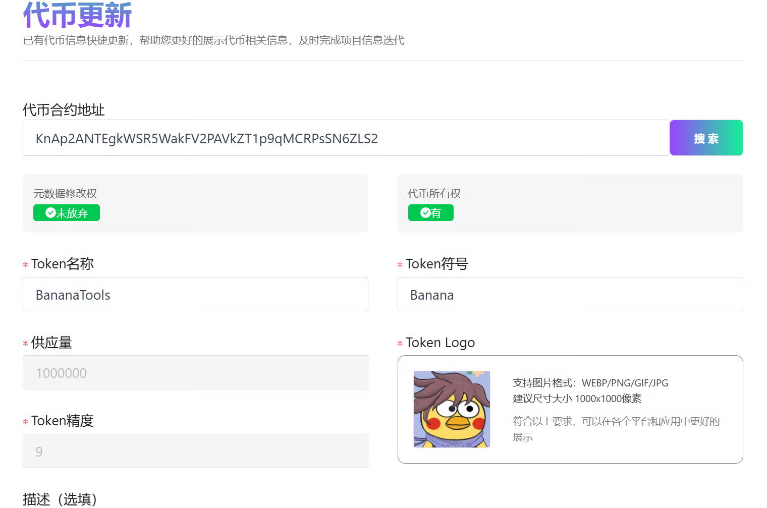 Solana链发币Solana代币更新教程On this pageSolana代币更新教程 代币更新视频教程 1、输入代币合约地址 输入代币合约地址后,点击搜索,下方会出现代币信息 代币更新必须拥有元数据修改权 3、确认修改 修改好资料后,点击确认更新按钮,弹出钱包,点击确认 其他问题 任何问题,都可以进入Telegram电报群找志愿者解答: https://t.me/BananaTools
