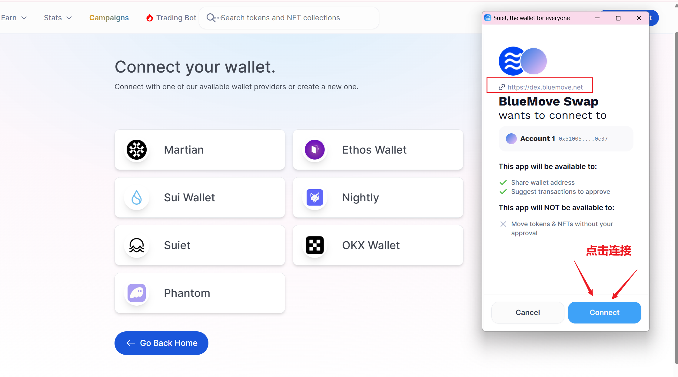 所有的链上操作第一步都是连接钱包,以识别你的地址。我们打开BlueMove的官网:https://dex.bluemove.net/ ,点击右上角连接钱包按钮