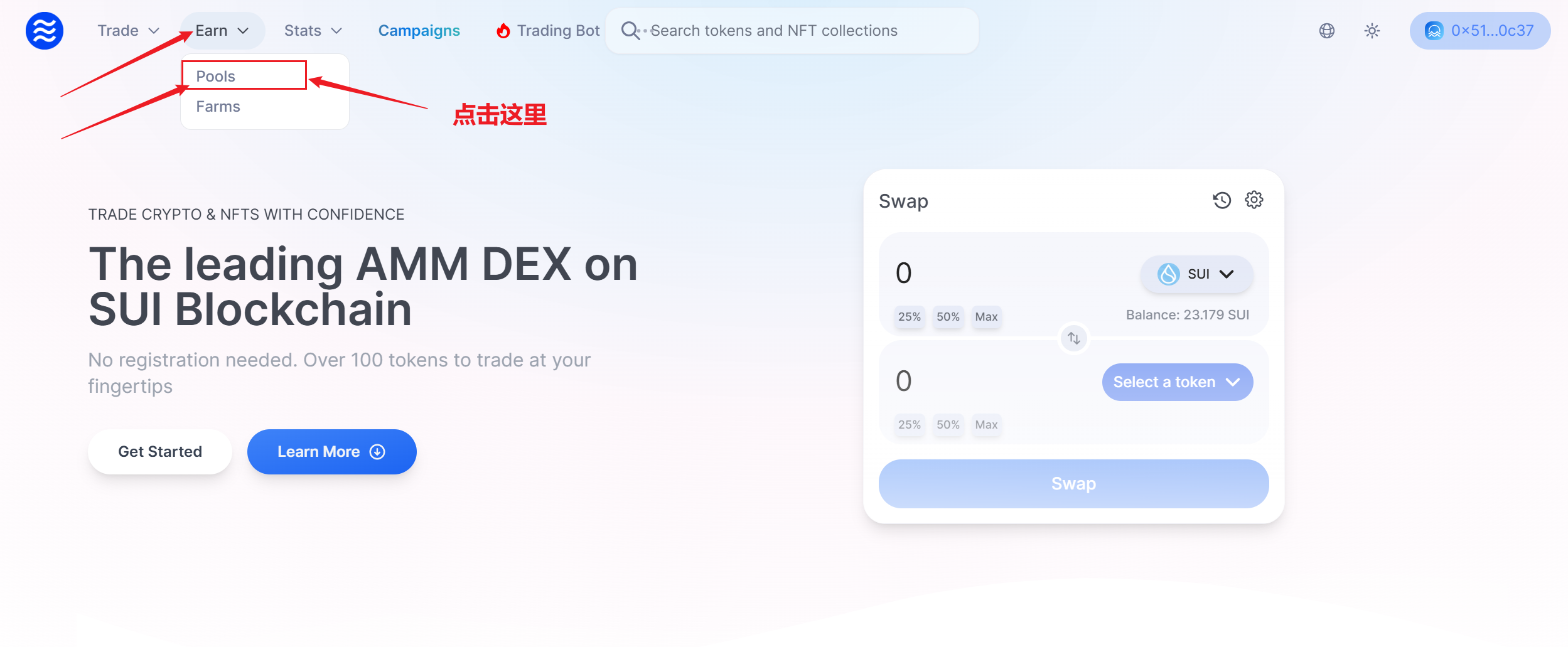 我们在首页找到Pools点击进入,直接通过链接进入:https://dex.bluemove.net/pool