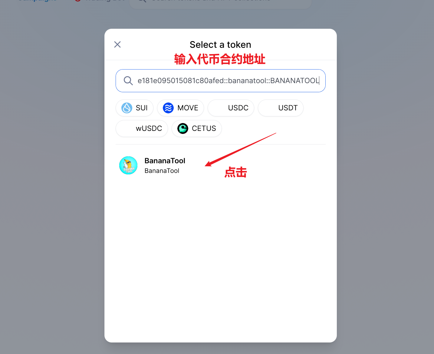 左边一般就选择Sui或者USDC、USDT这些,右边就是我们自己发行的土狗币,通过合约地址进行搜索
