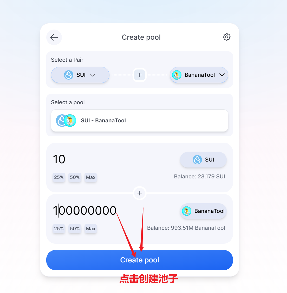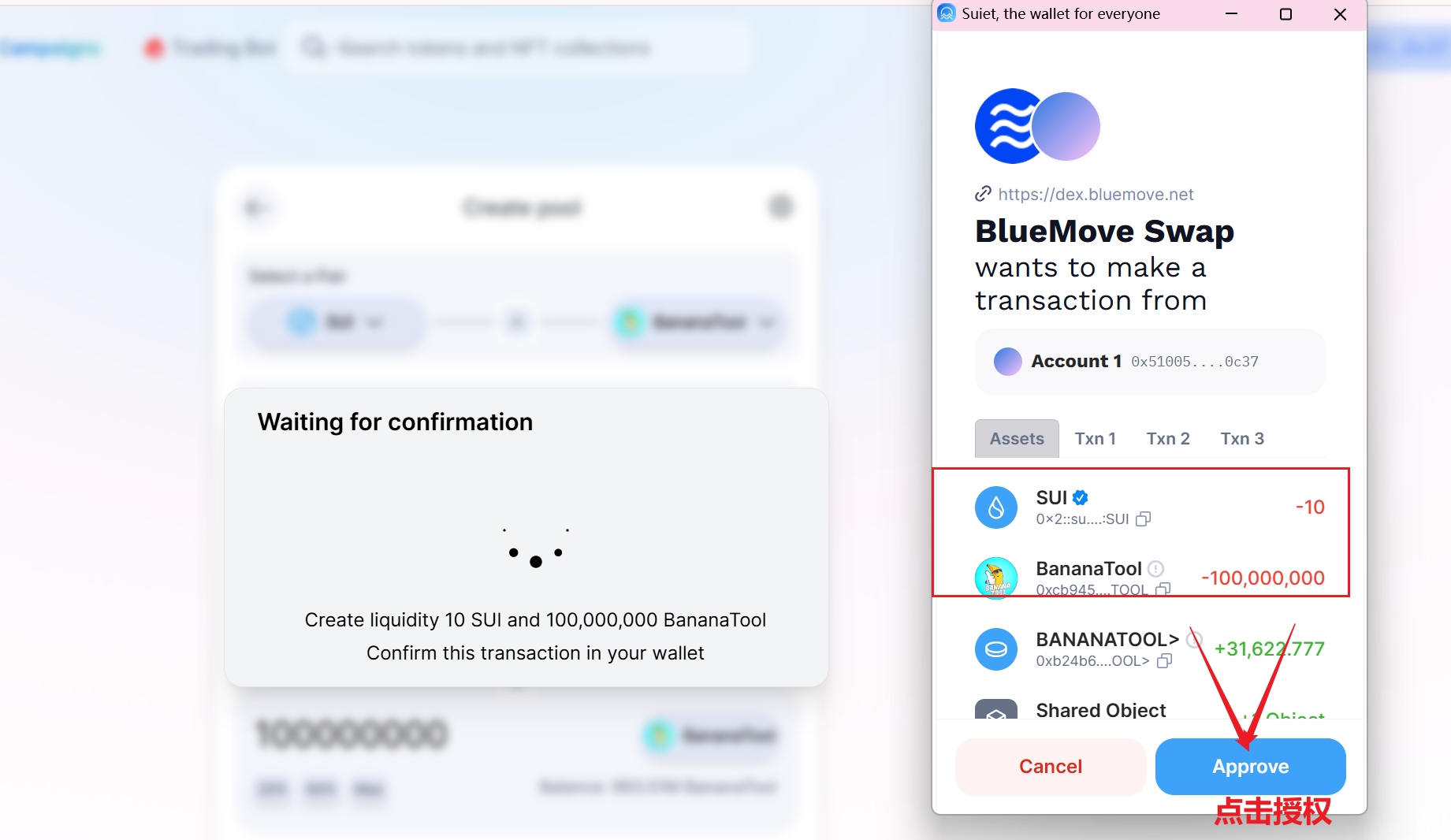 确定自己输入的代币数量和SUI数量无误后,点击Creat Pool,此时会弹出钱包让你确认