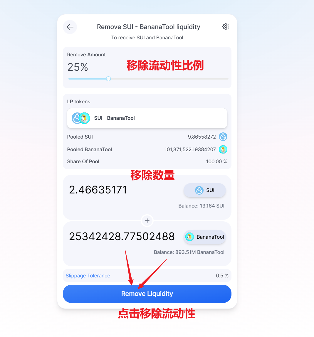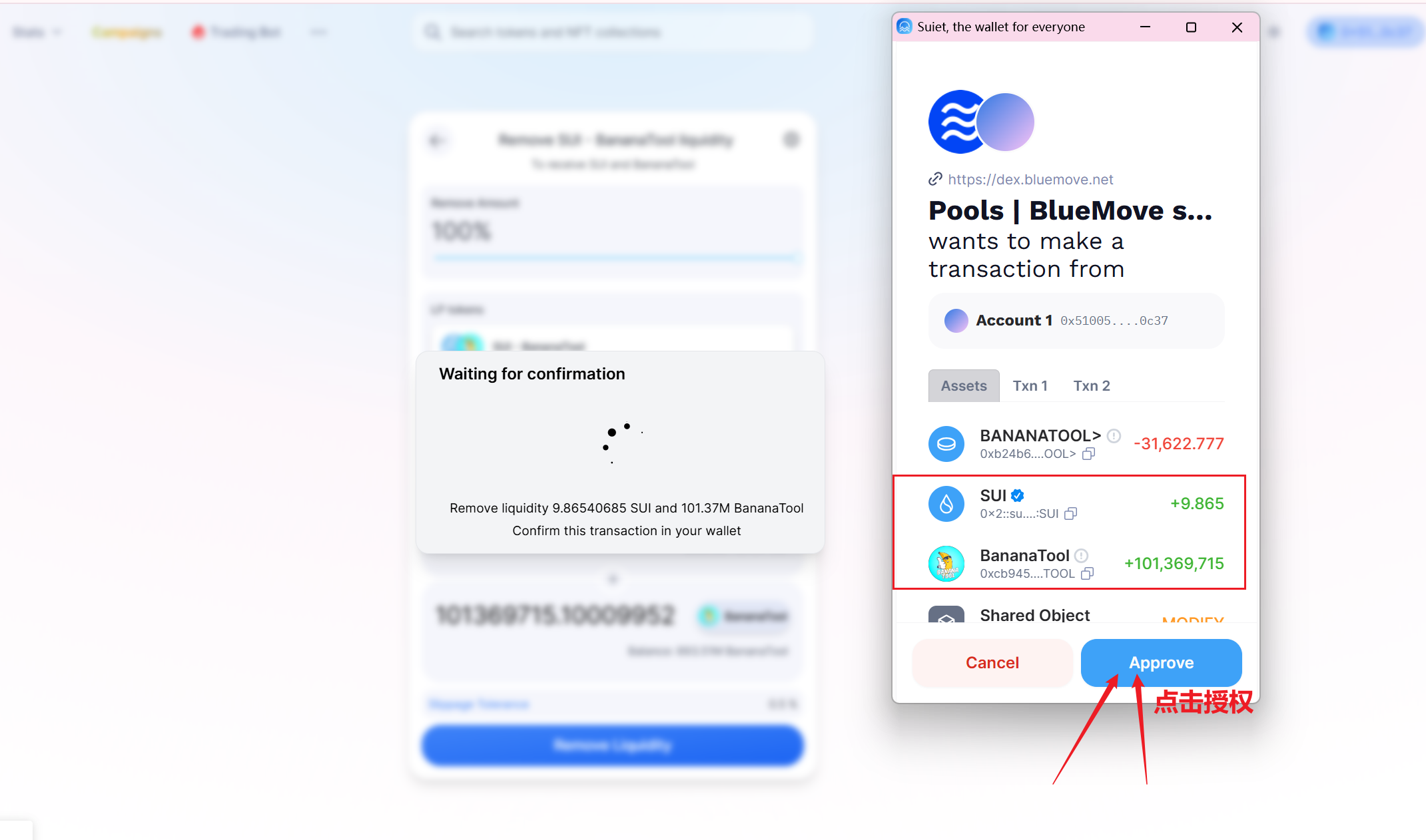 点击钱包的Approve按钮,等待几秒钟后,即可完成流动性的撤出