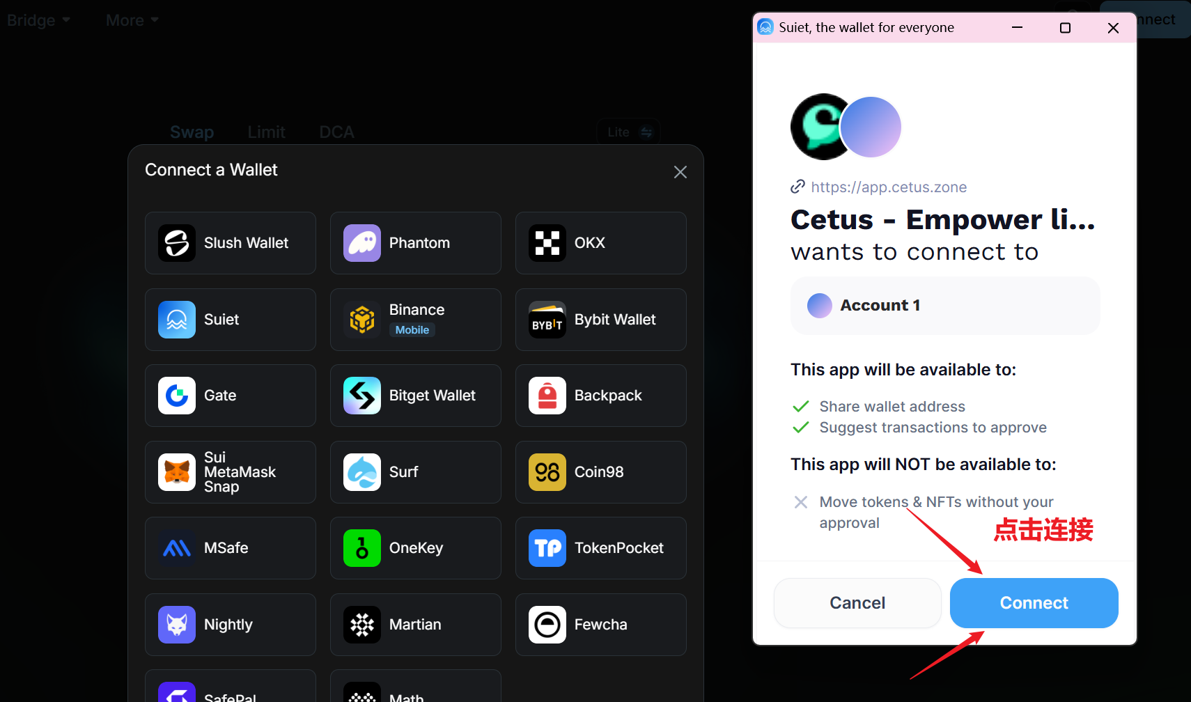 连接钱包是所有操作的第一步,老手可以直接忽略。我们打开Cetus的官网:https://app.cetus.zone/,点击右上角连接钱包按钮