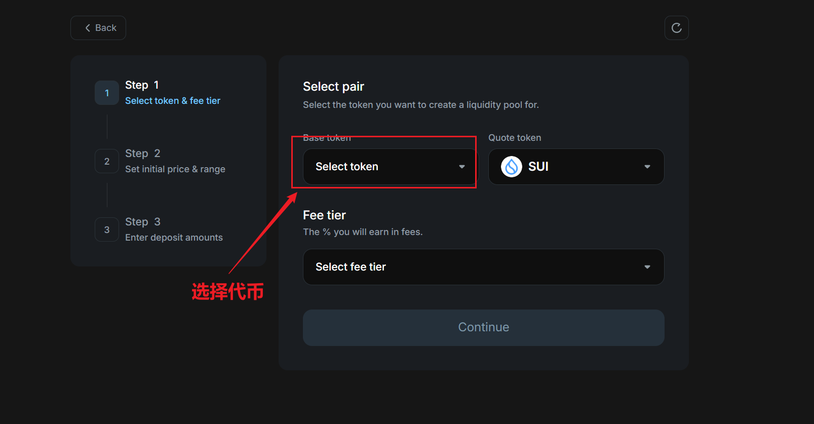 进入我们进行代币选择页面,左边一般是自己发行的土狗币,右边是SUI