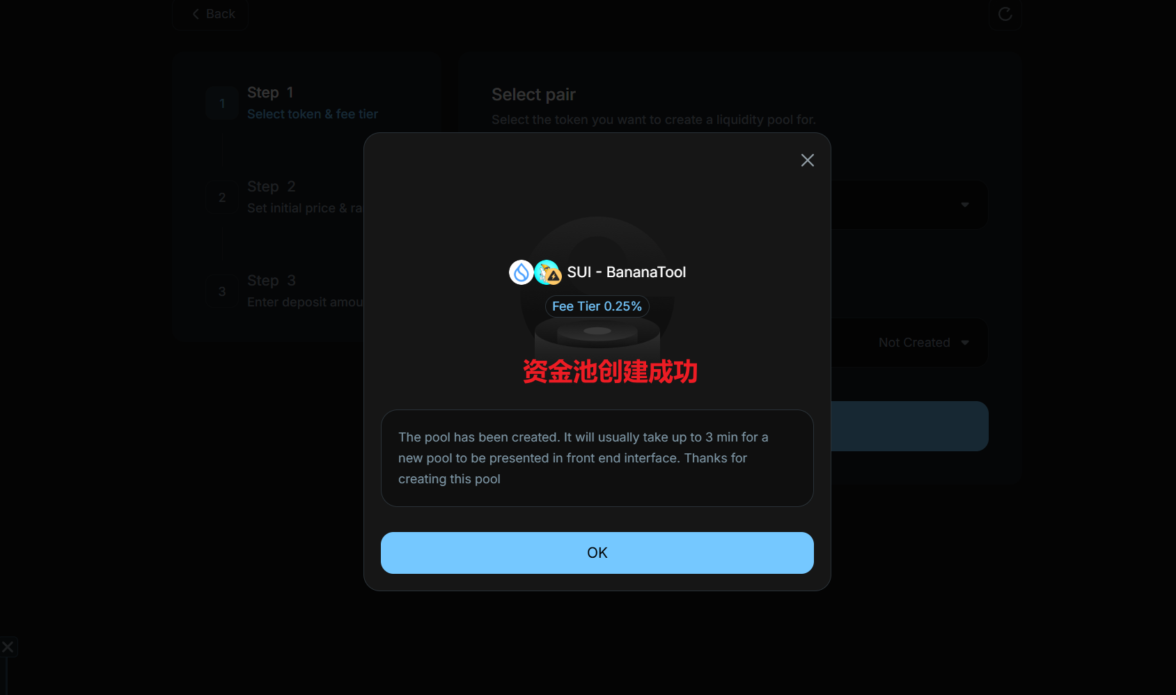 之后,我们填写要加池子的金额。例如,我选择加10个SUI,交易所会自动给我配对1亿个左右的BananaTool,确认数量后,点击Crate按钮即可