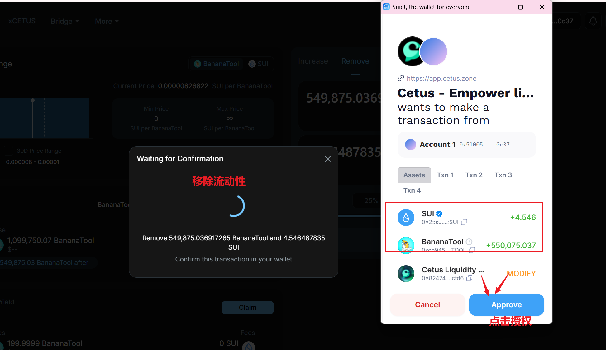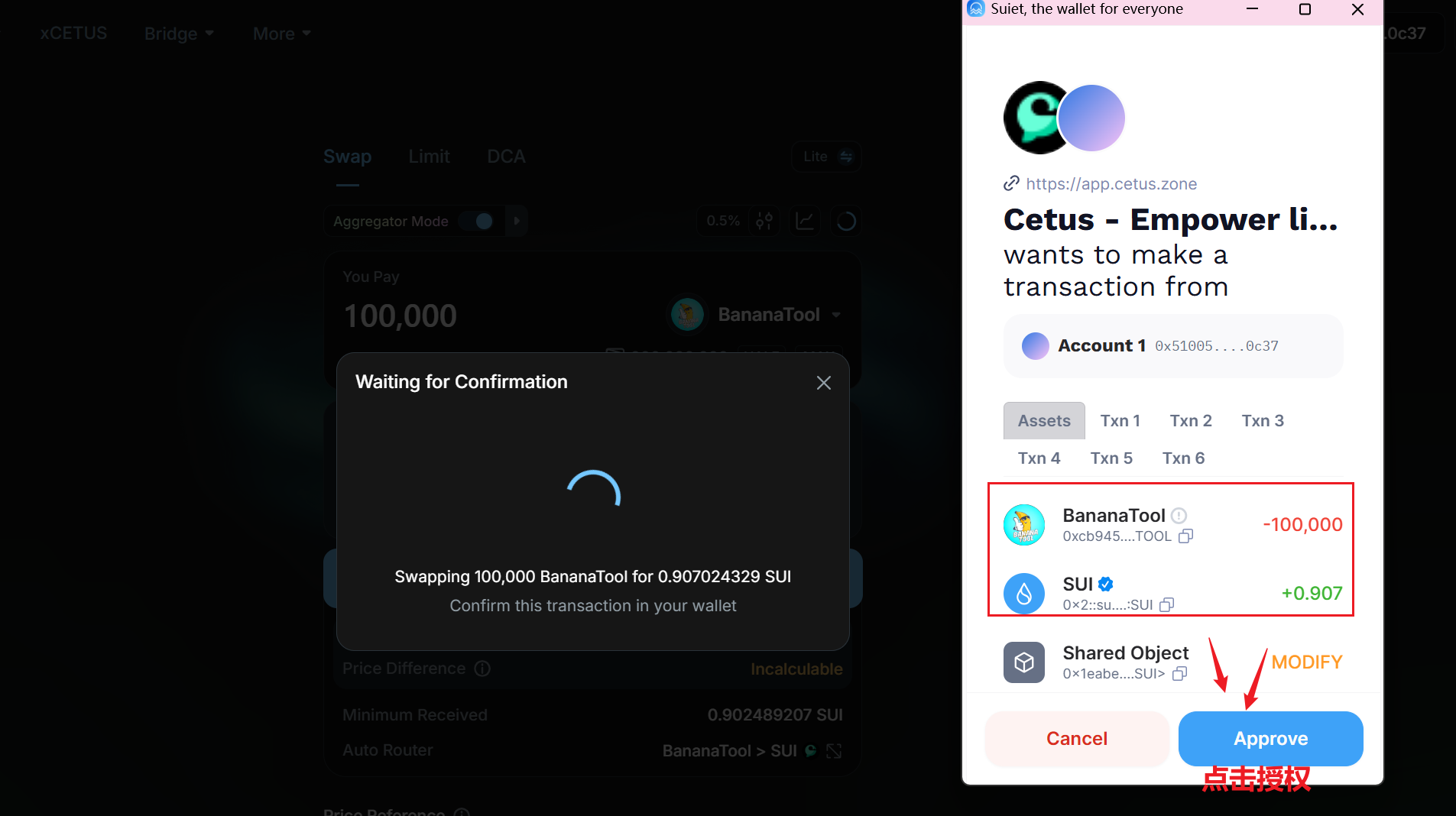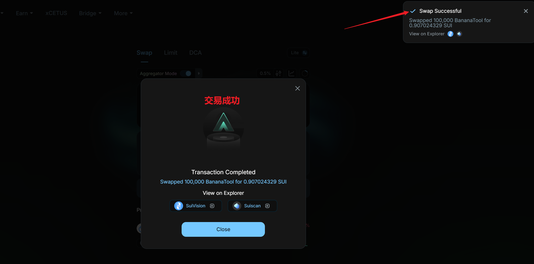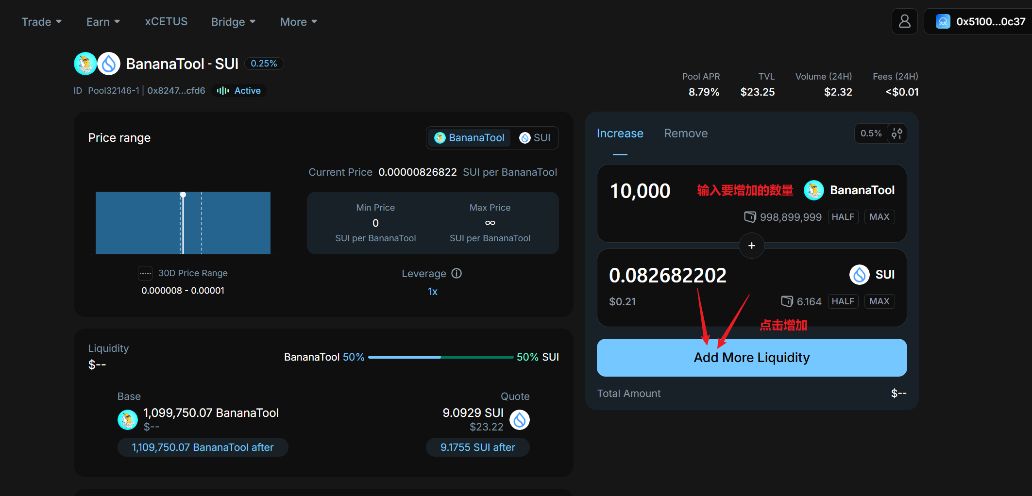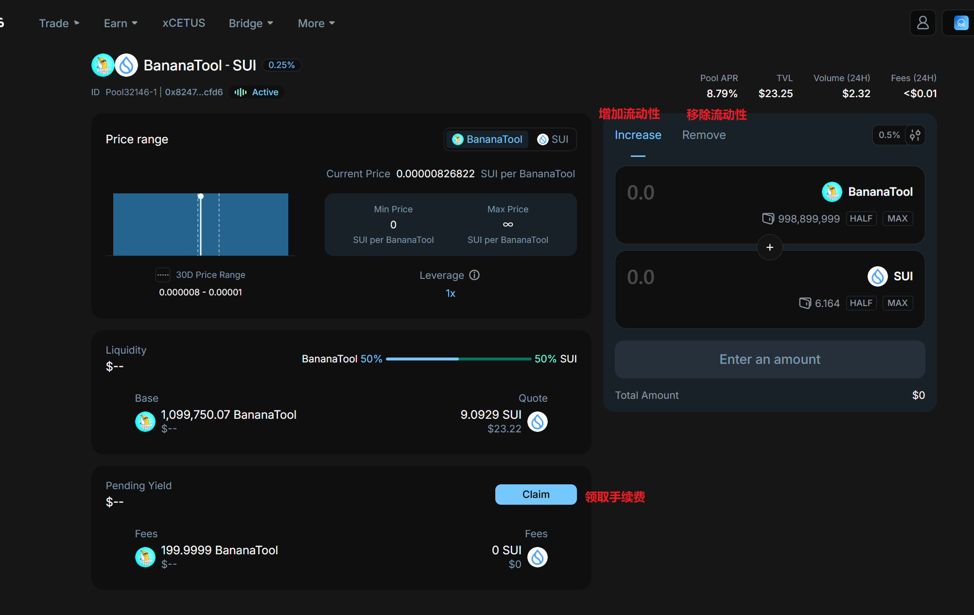 我们回到Cntus的官网首页:https://app.cetus.zone/ ,在交易对那里输入BananaTool的合约地址,进行一笔100000的代币卖出