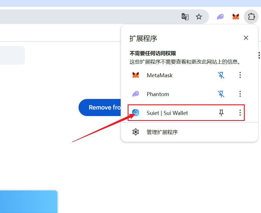 等待大概20秒钟,钱包插件就会自动安装完成。我们通过谷歌浏览器右上角,可以找到相应的Suiet钱包