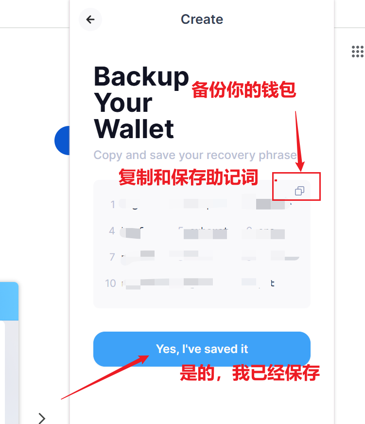 填入好密码之后,点击下一步,进行钱包的备份,并复制钱包助记词