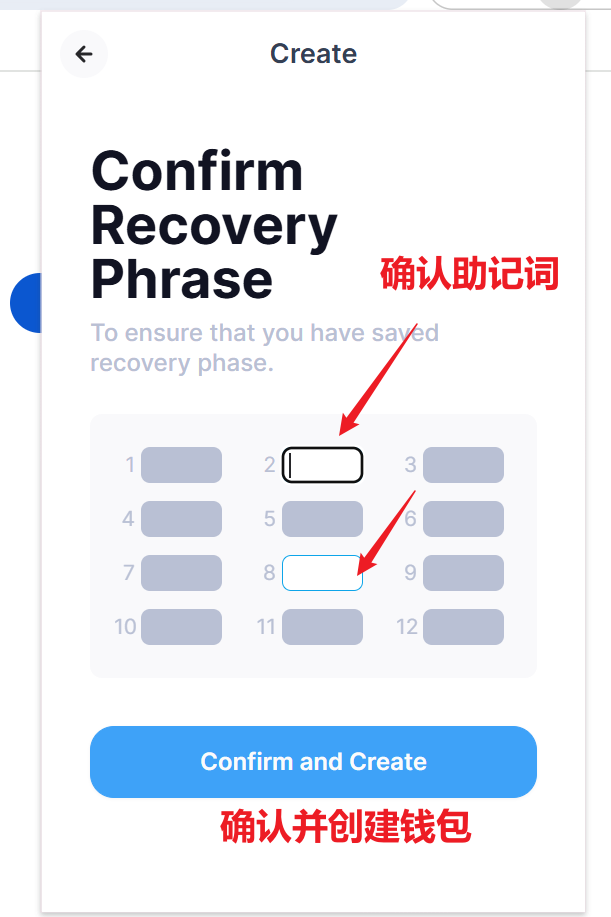 这个步骤主要是要求我们确认助记词是否牢记,他会随机给出两个空格,让你填写每个位置相应的单词。助记词的单词都是按照顺序排列的,把相应的单词填入空格中,点击确认即可