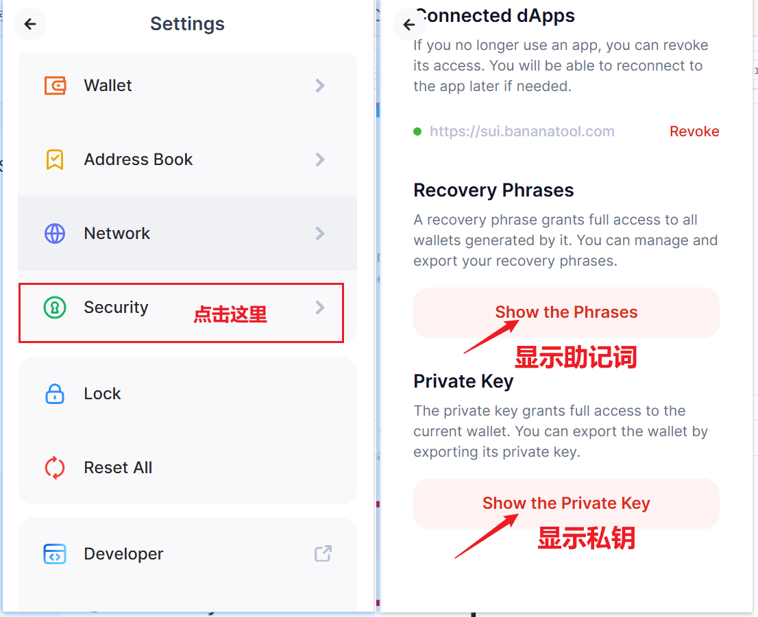 假如我们想导出钱包的私钥,那么需要点击Security,进入操作