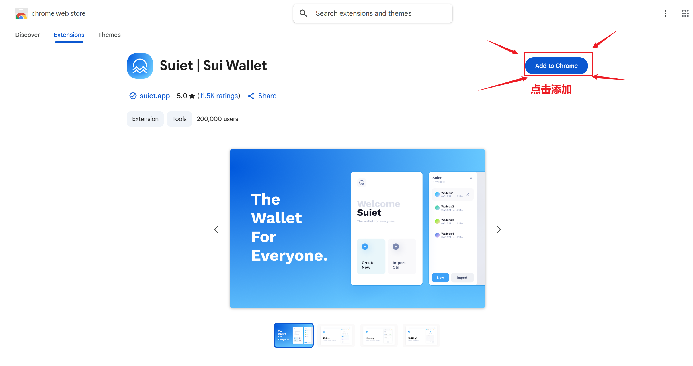 然后会跳转到谷歌应用商店:https://chromewebstore.google.com/detail/Suiet%20%7C%20Sui%20Wallet/khpkpbbcccdmmclmpigdgddabeilkdpd,点击添加至Chrome