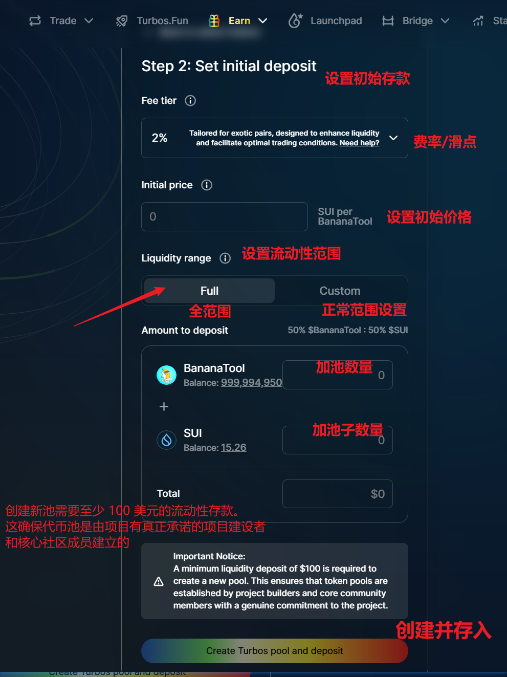 - 设置初始价格:即代币的上线价格,如果是SUI池子,则该价格以SUI计价,例如我要设置Banana的上线价格是0.0000001 SUI,那么在这个输入框里填入0.0000001即可