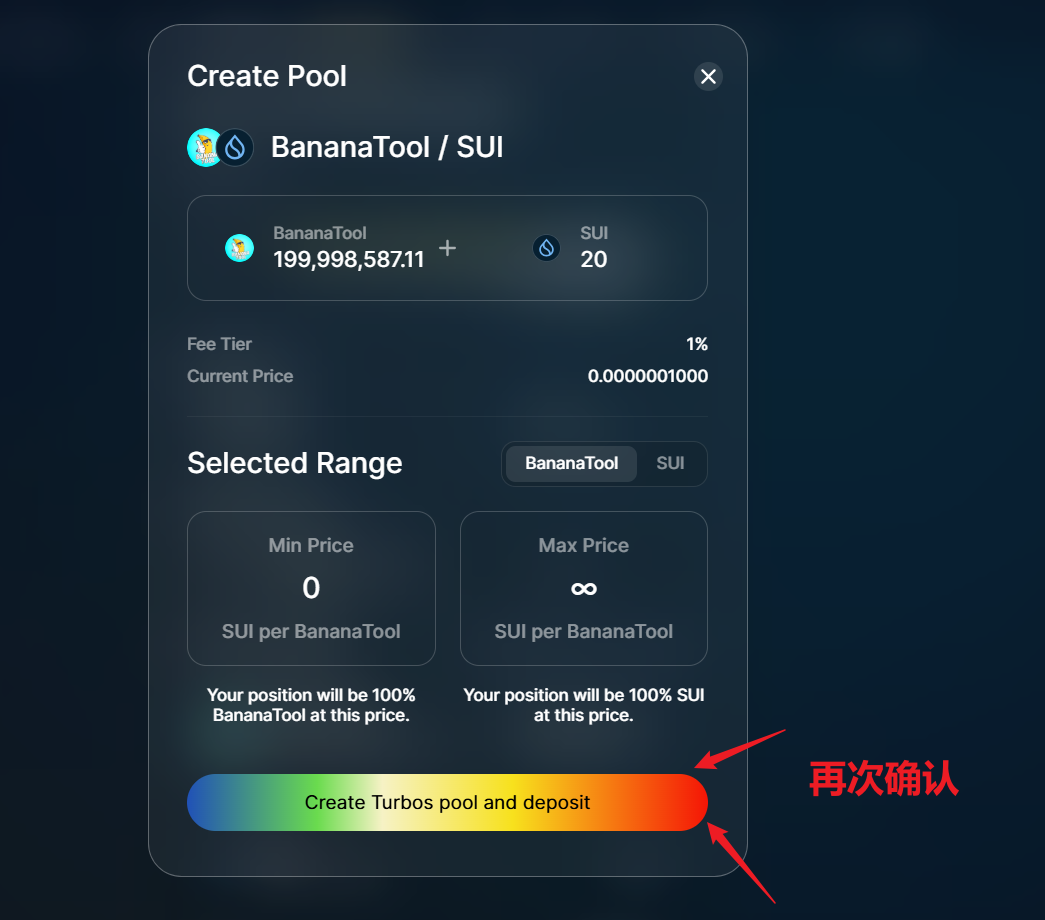 填写完成之后,点击Create Turbos pool and deposit(创建池子并存入代币),进行二次确认
