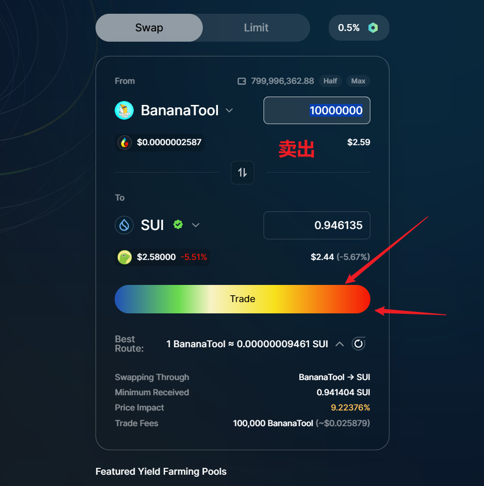 例如我通过合约地址选择BananaTool作为基础代币,SUI作为报价代币,就是下面这样