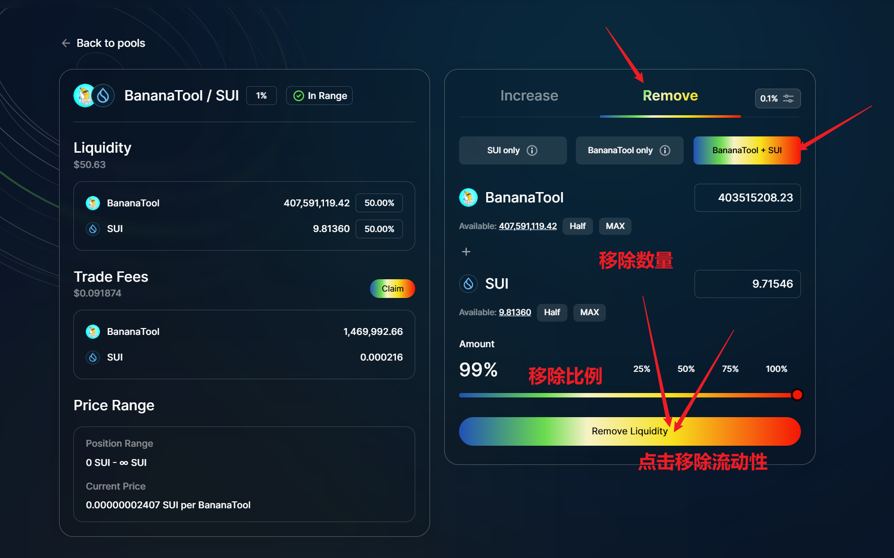 假设我们点击撤出流动性,就可以按照比例进行移除相应的代币,然后钱包确认即可
