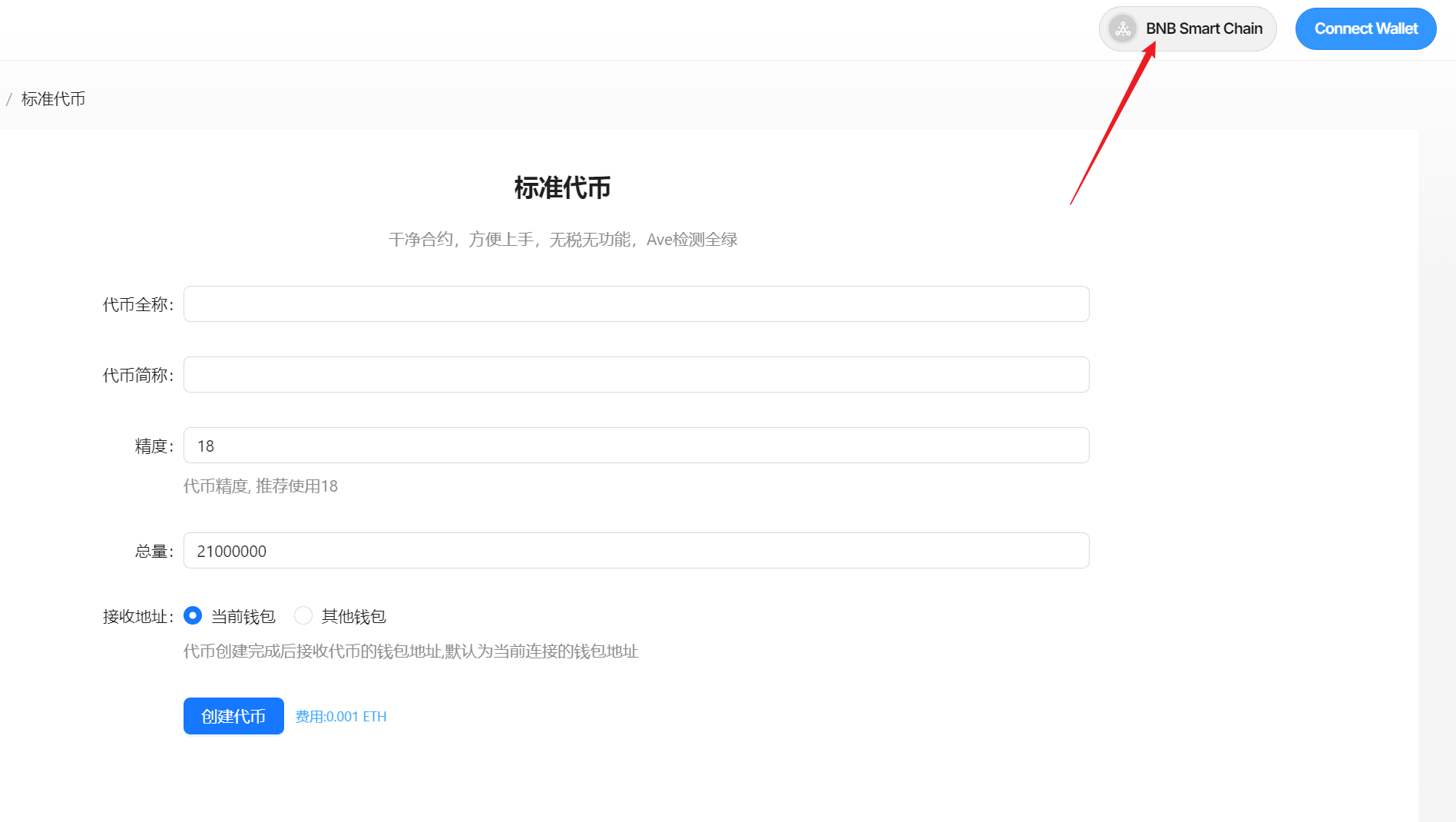 根据以下步骤,您可以在可支持的任意一条链上,创建一个标准合约代币。以BSC为例。