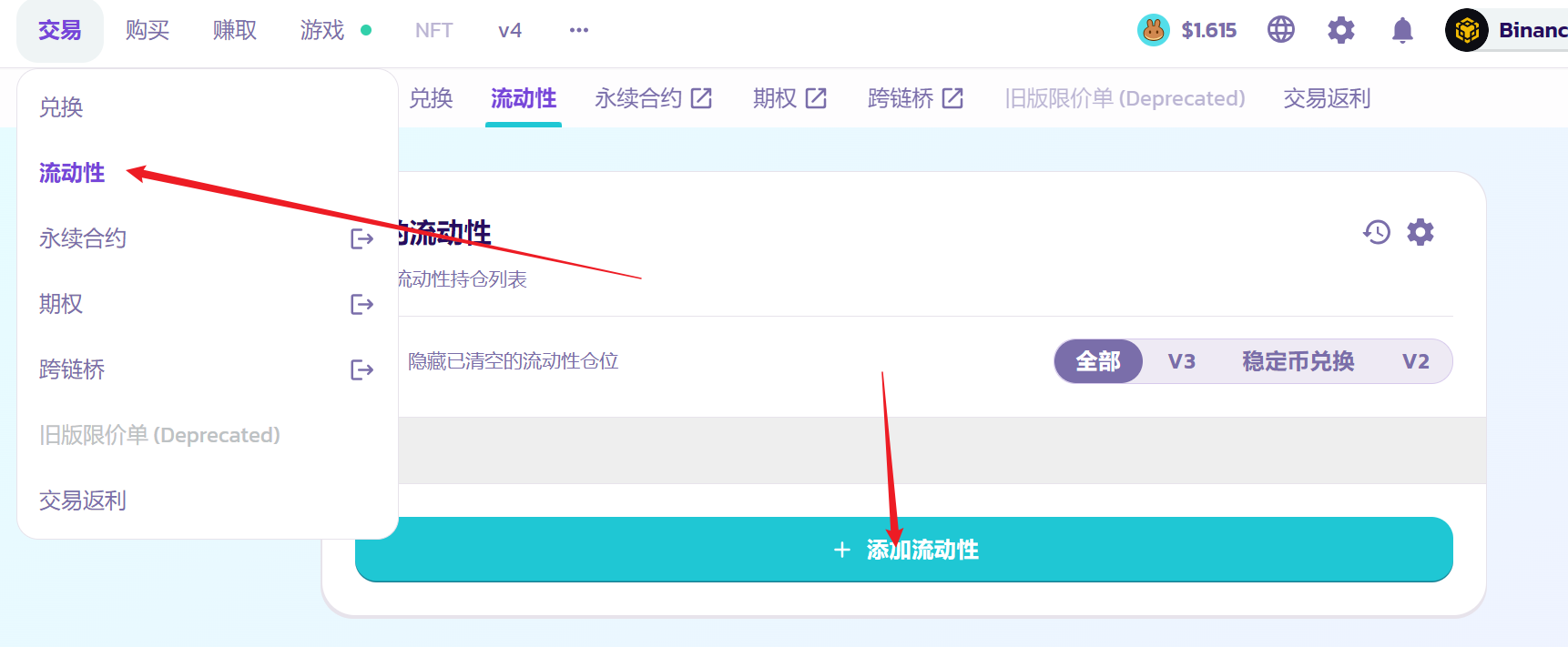 我们打开测试链薄饼:https://pancakeswap.finance/,找到“交易-流动性”: