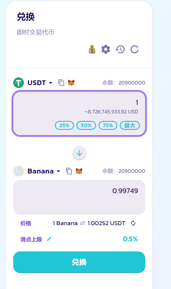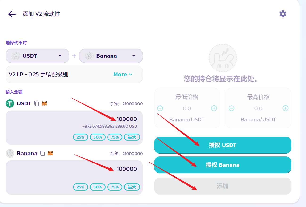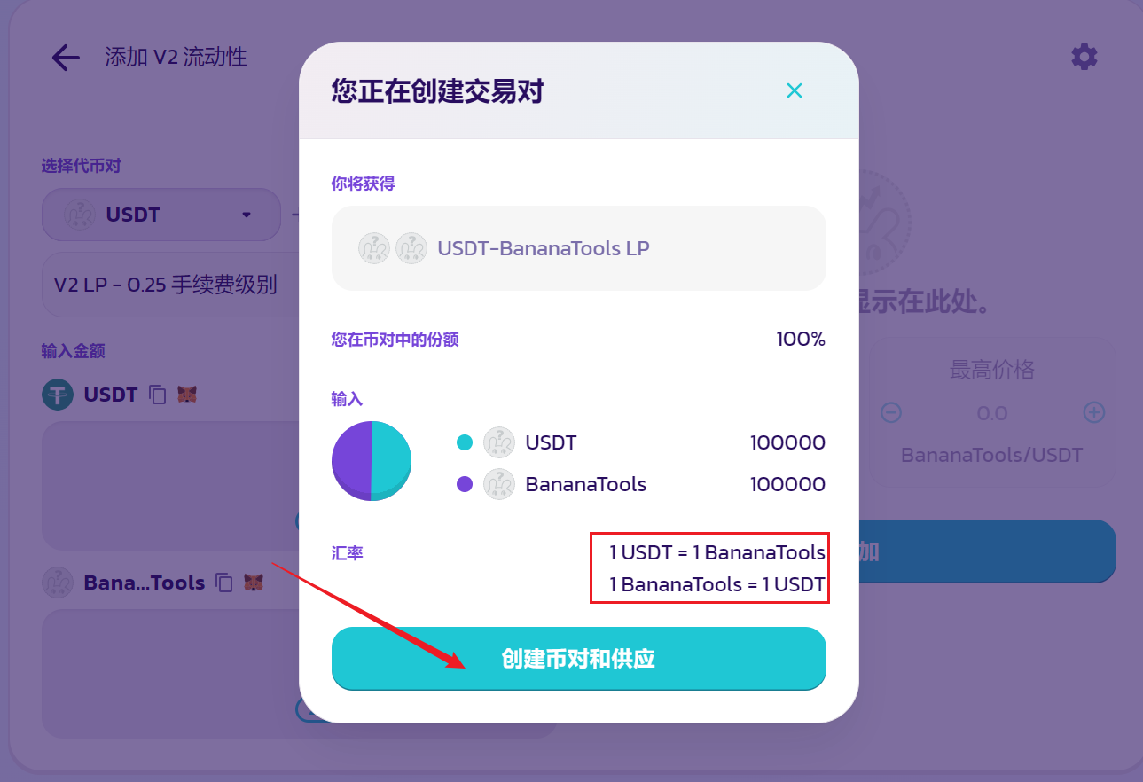 两种代币的数量比例,决定了代币上市的初始价格。例如上面,我们放入了100000个USDT和100000个Banana,就说明Banana的上市价格是1USDT。