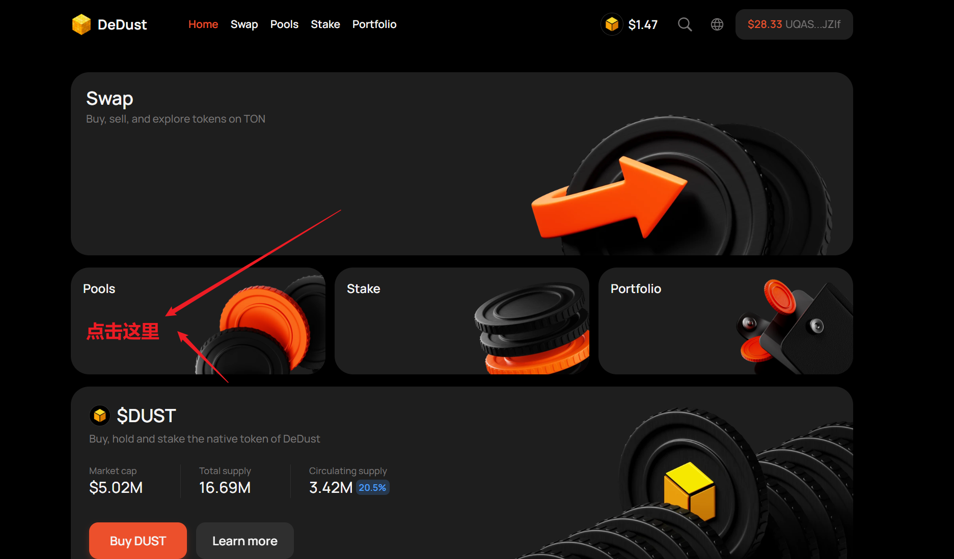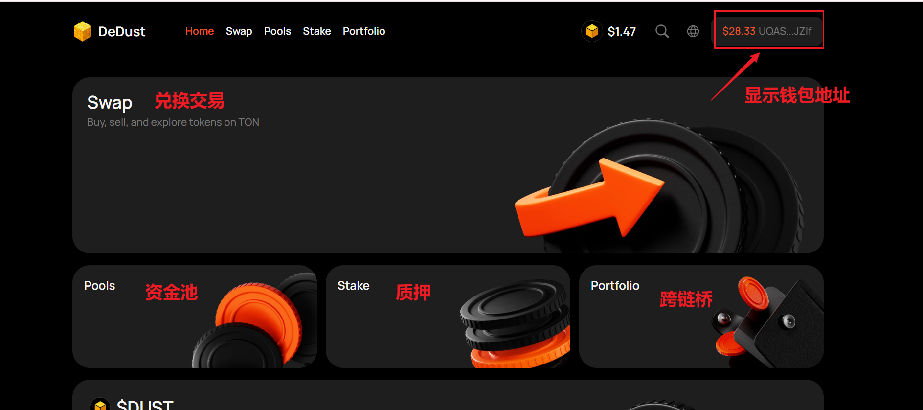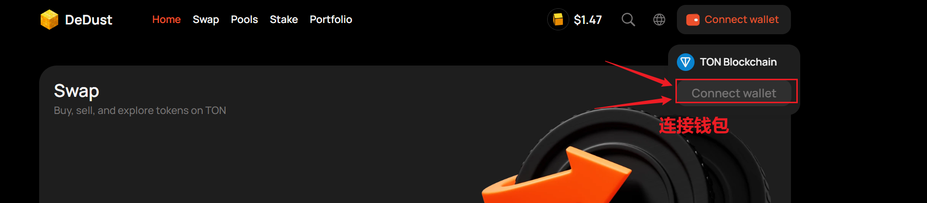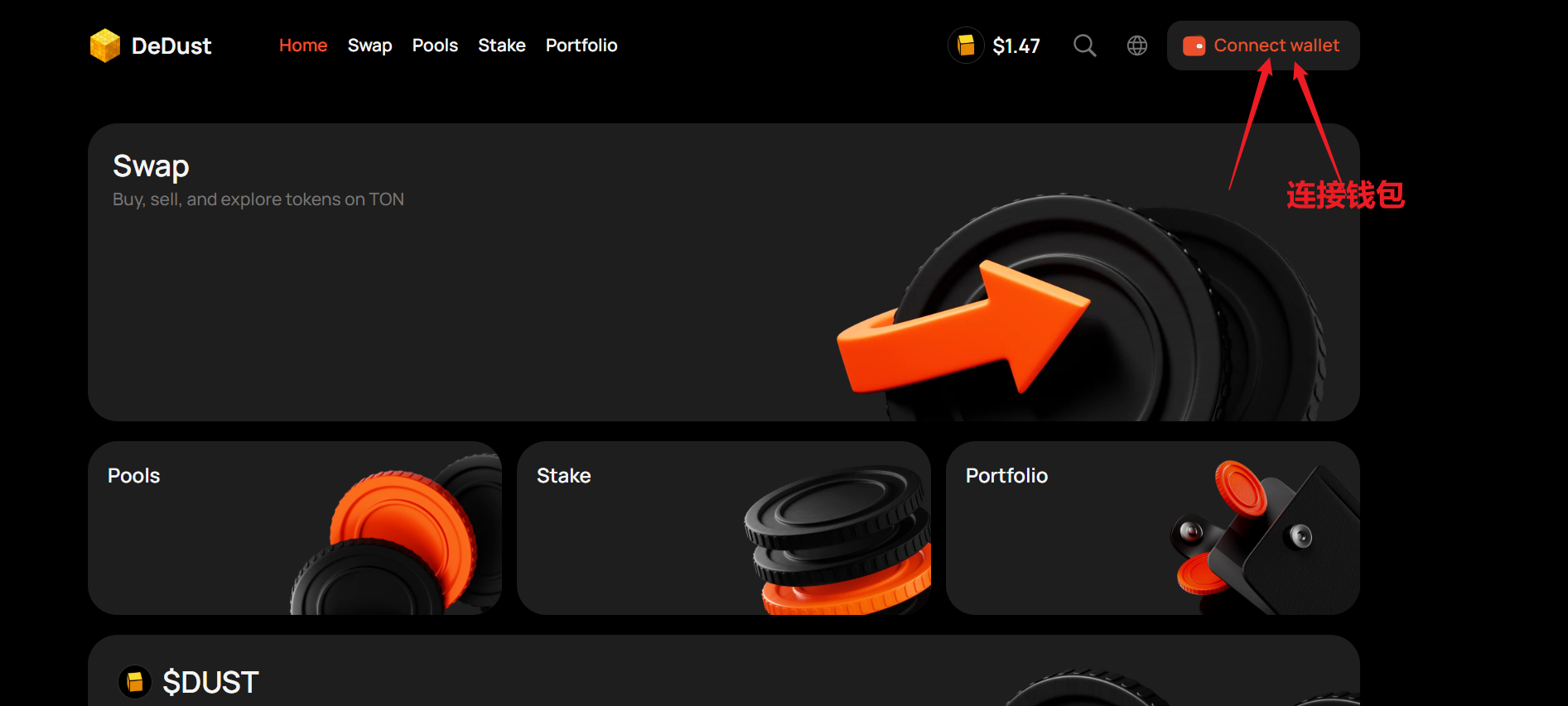 首先,我们打开DeDust的官网:https://dedust.io/,点击右上角Wallets,根据提示再点击Connect Wallet连接钱包