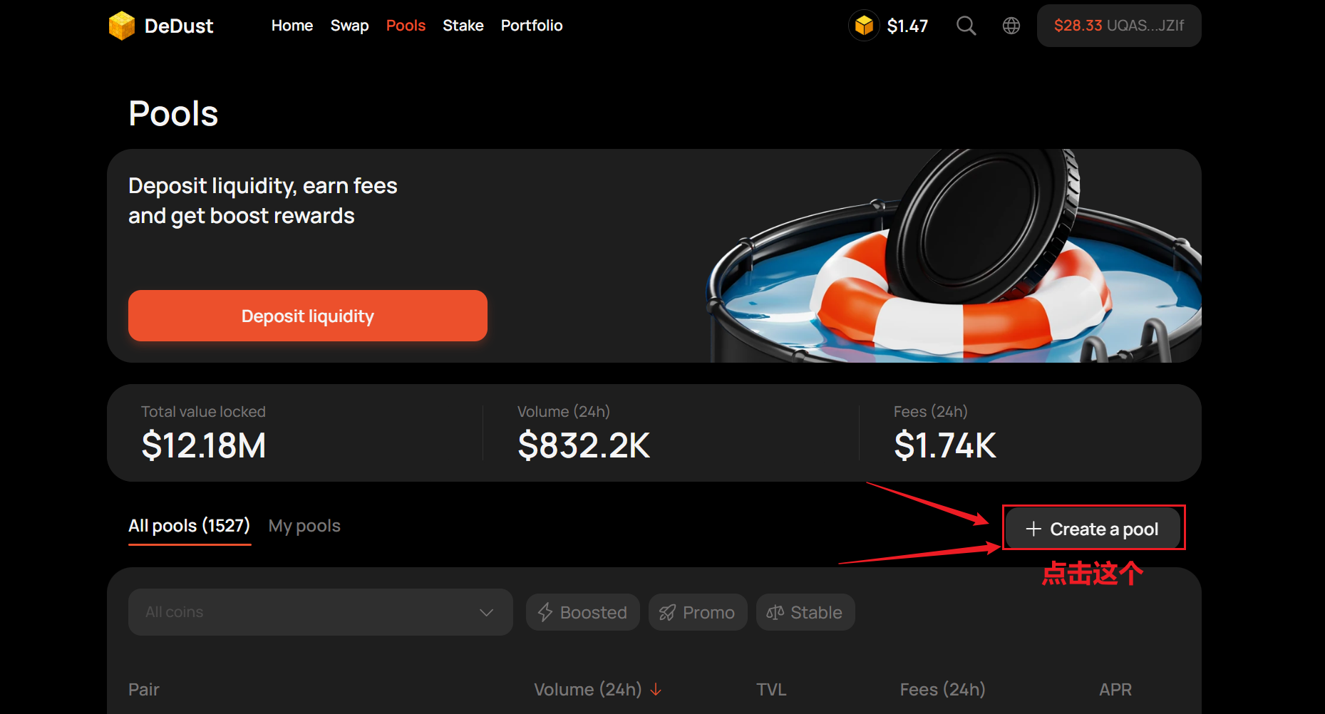 点击页面的Pools,或者直接打开页面:https://dedust.io/pools ,点击Creat Tool(创建池)