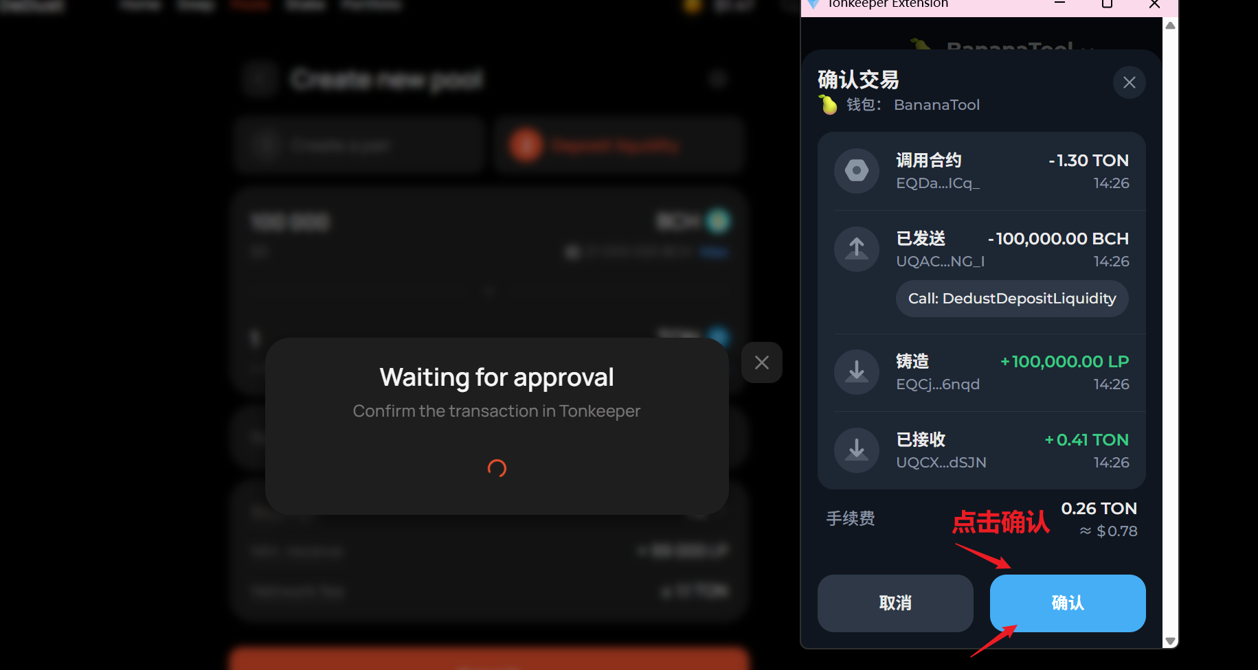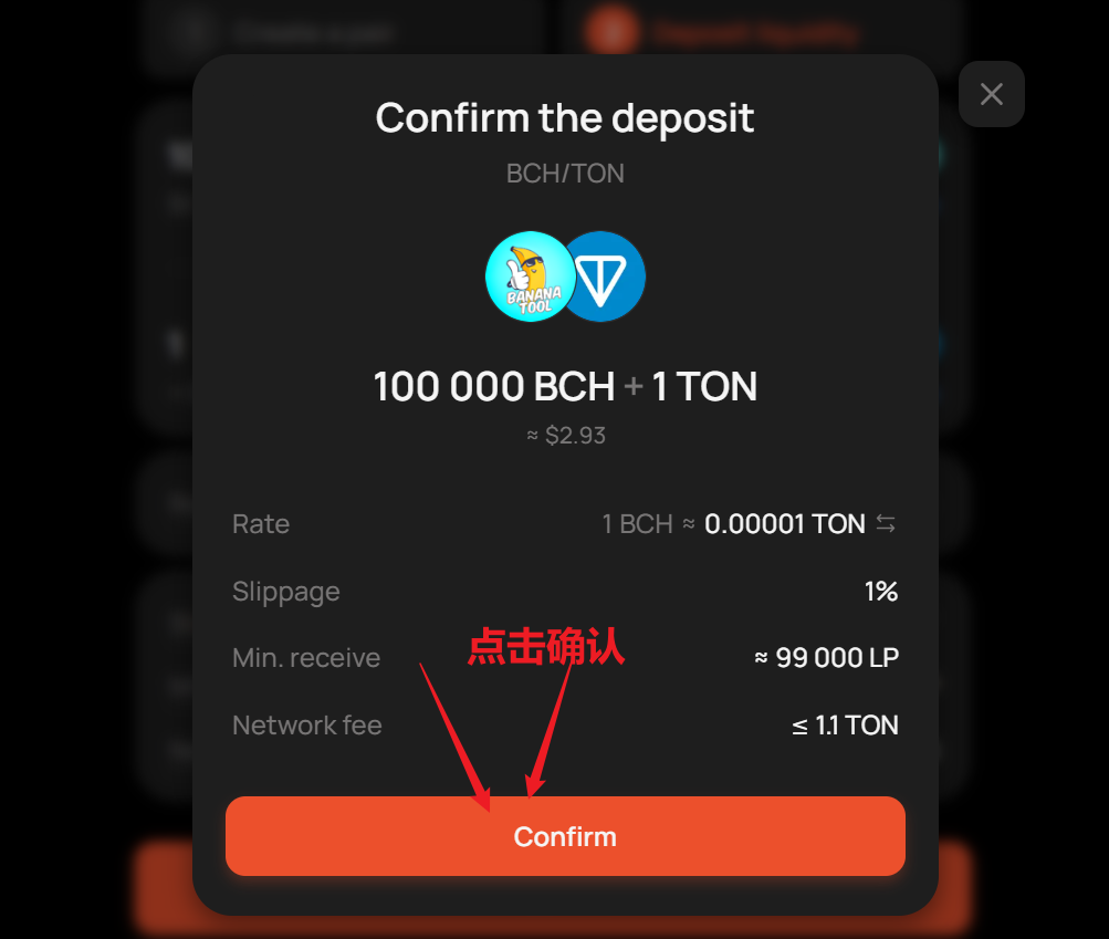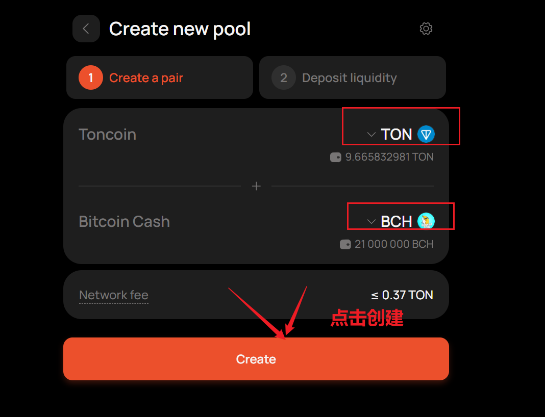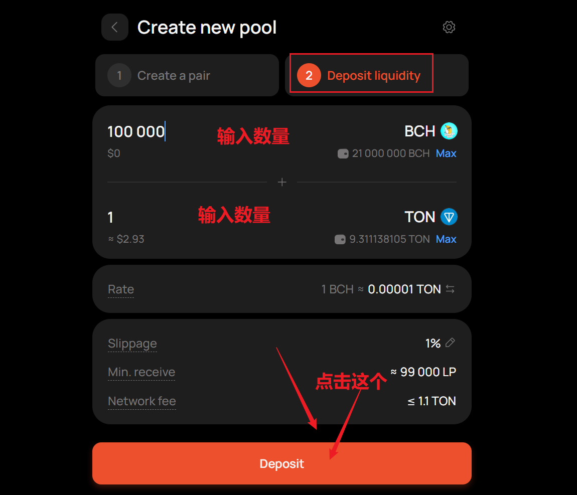 然后在打开的页面中输入你要加池的TON的数量,以及你要加池的代币地址与数量