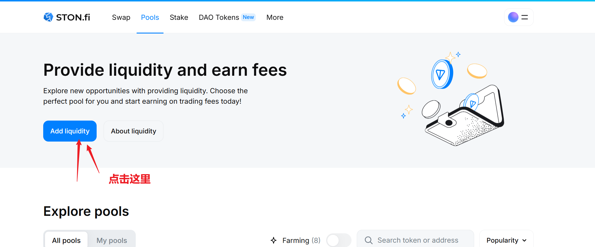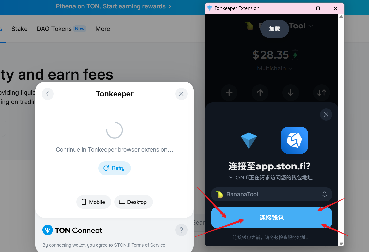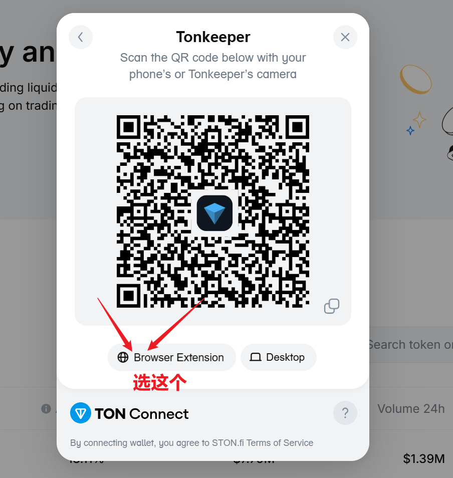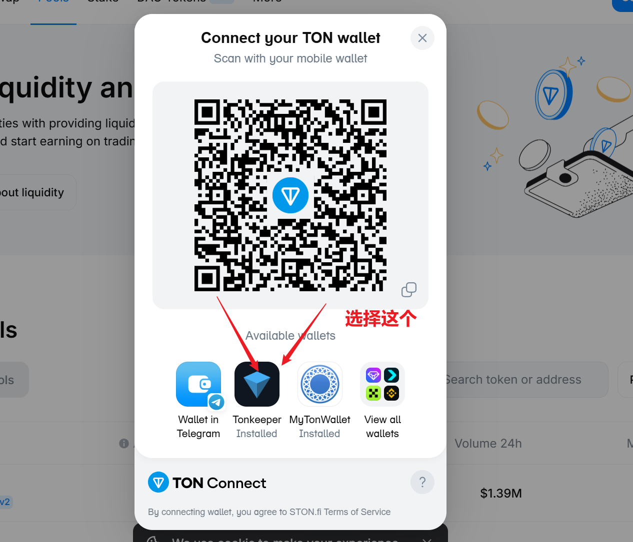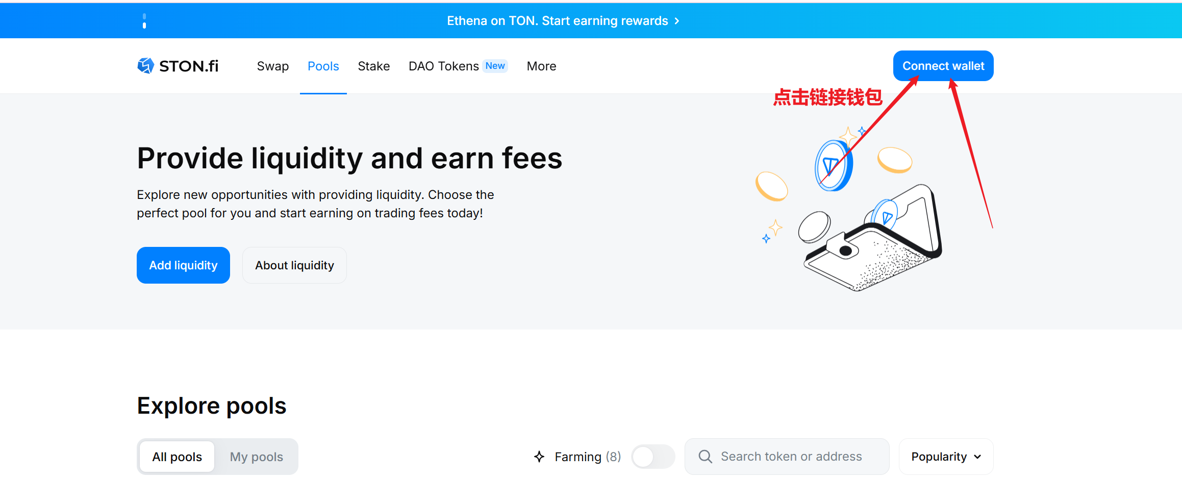 首先,我们打开STON的官网:https://app.ston.fi/pools ,点击右上角Connect Wallet