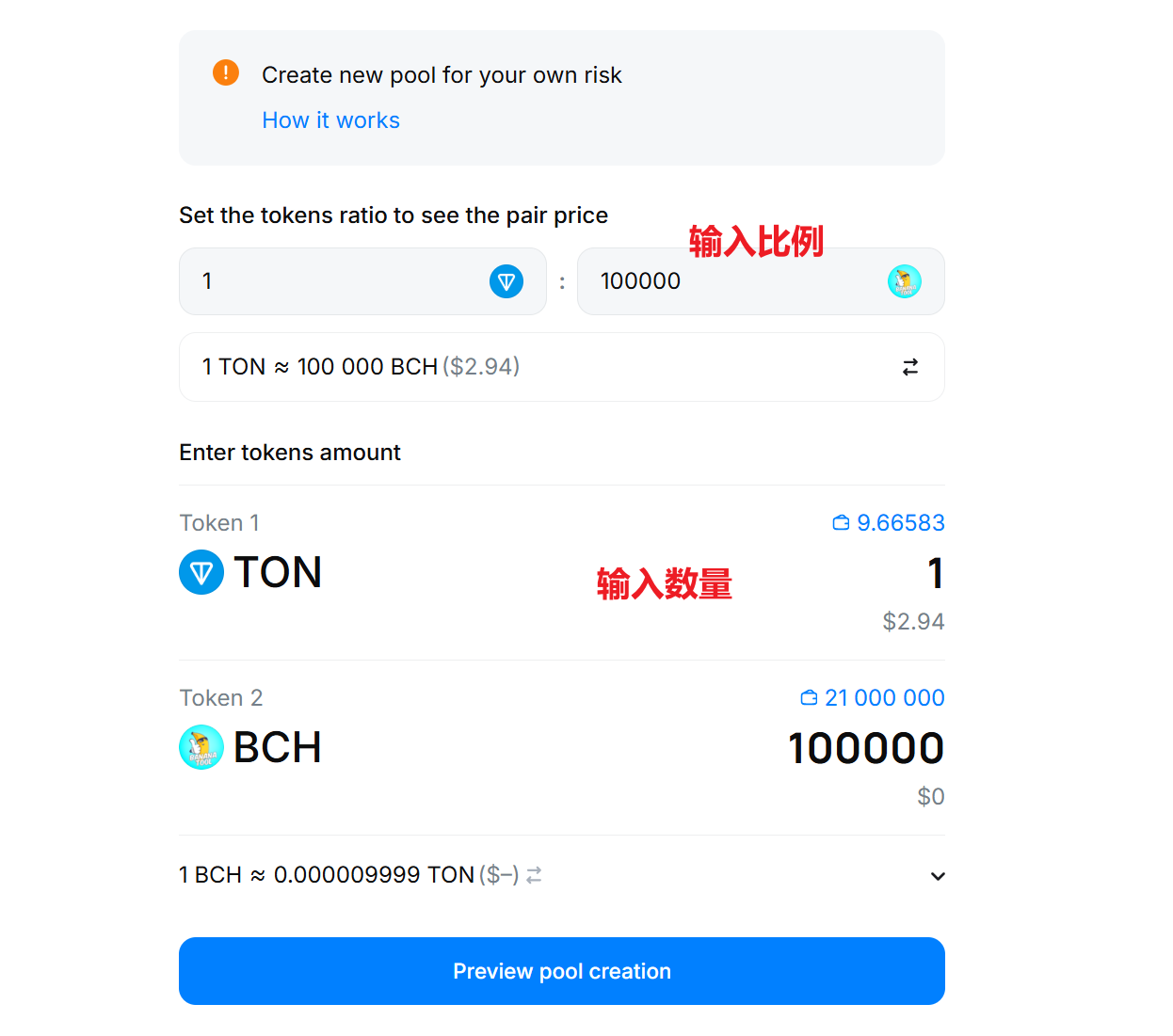 注意,两个代币数量的比例,决定了代币的初始价格。例如,我添加1TON和100000个BCH,说明BCH代币的上线价格是0.00001TON。按照TON的价格3U计算的话,我的代币上线初始价格就是0.00003