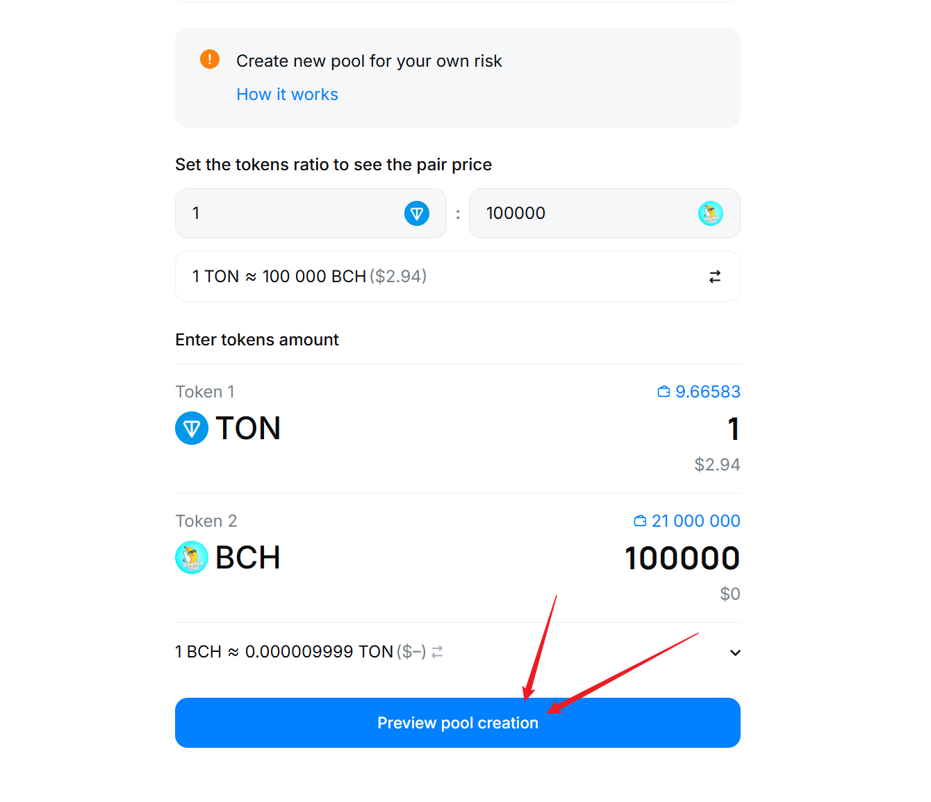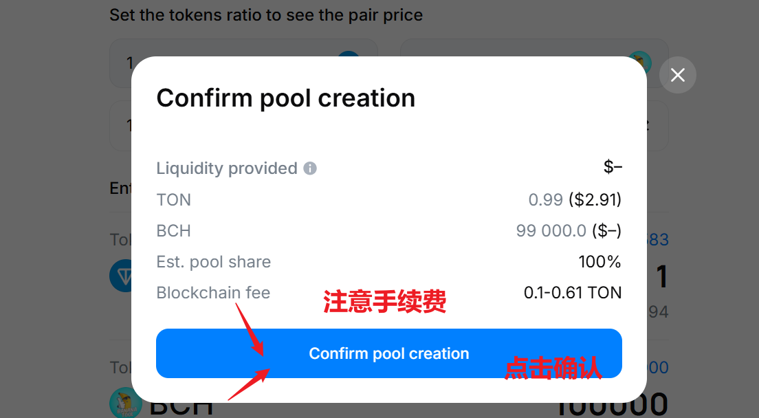 确定好数量和比例后,点击Preview pool creation,此时会让你进行二次确认