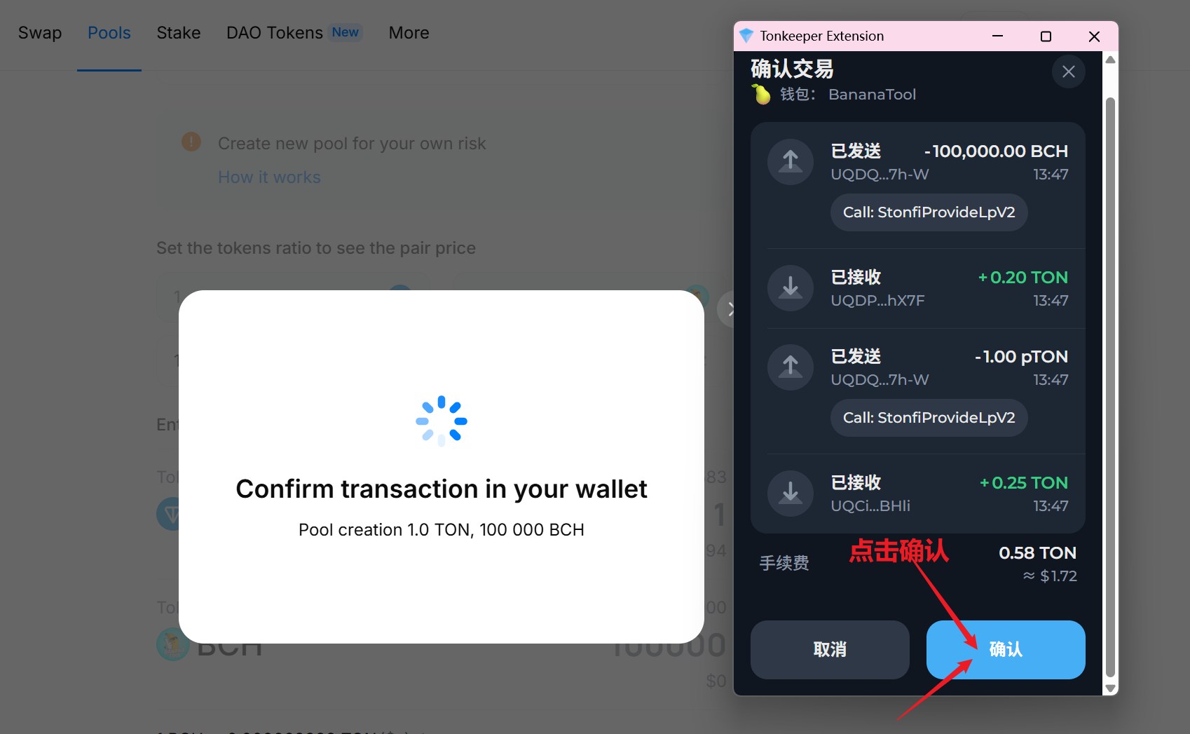 注意,创建一个资金池,可能需要支出0.3~1.6TON的手续费,所以建议你的钱包至少得有2TON。如果算上加池子的费用,可能还需要更多的TON。