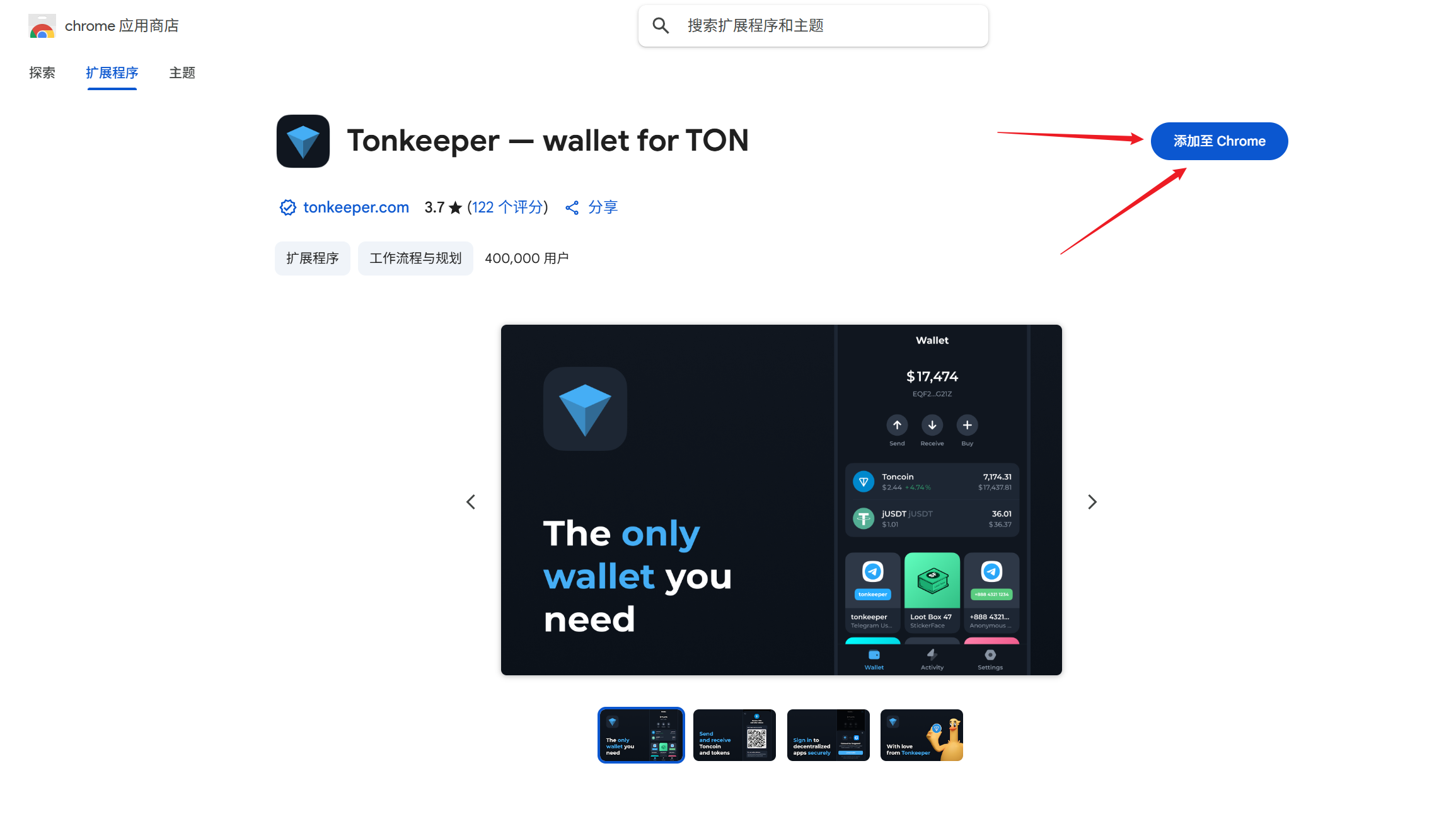 我们打开谷歌浏览器,点击Tonkeeper钱包插件安装页面:https://chromewebstore.google.com/detail/tonkeeper-%E2%80%94-wallet-for-to/omaabbefbmiijedngplfjmnooppbclkk?utm_source=tonkeeper_index ,点击添加至Chrome