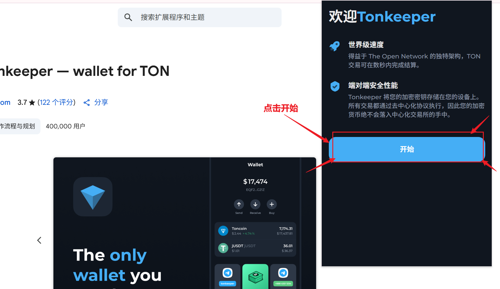 我们在谷歌浏览器上方找到已经安装好的钱包插件,打开并点击开始