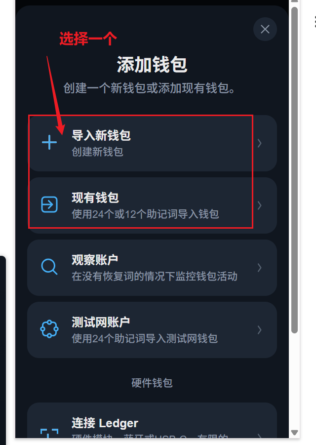 之后会提示你让你选择:创建新钱包或者导入现有钱包。如果你有钱包助记词,就导入钱包。如果没有助记词,就选择创建新钱包
