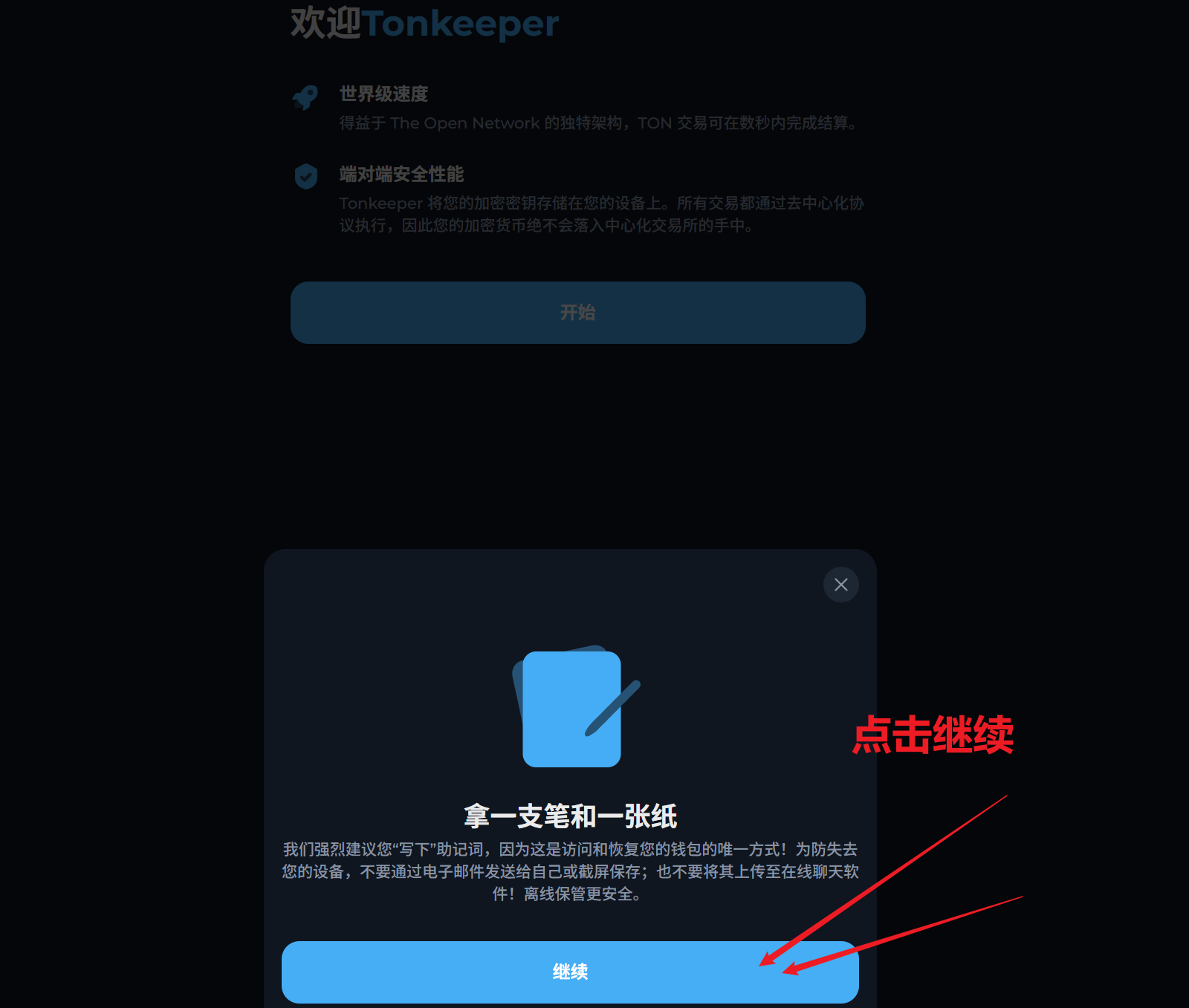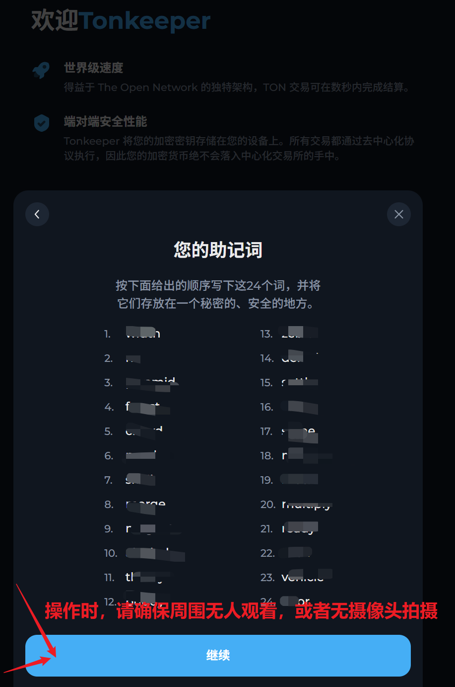 假设我们选择创建新钱包,之后会跳转到一个页面,让你准备记录下你的助记词