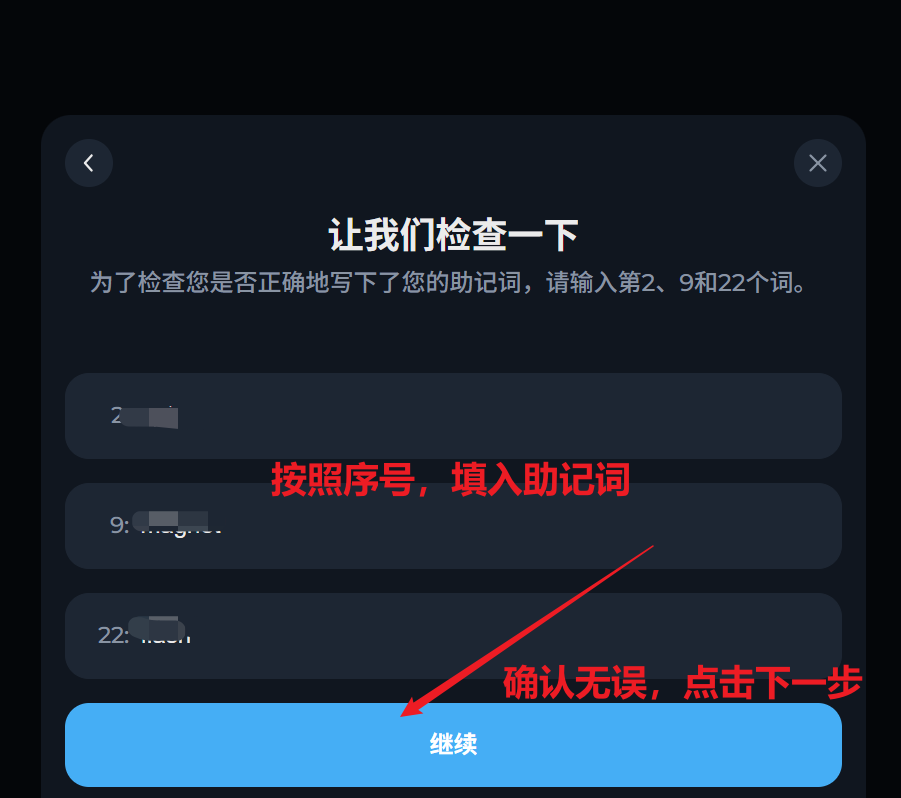 之后,会让你验证助记词。按照他给的序号,填入相应的助记词(注意大小写),即可完成操作