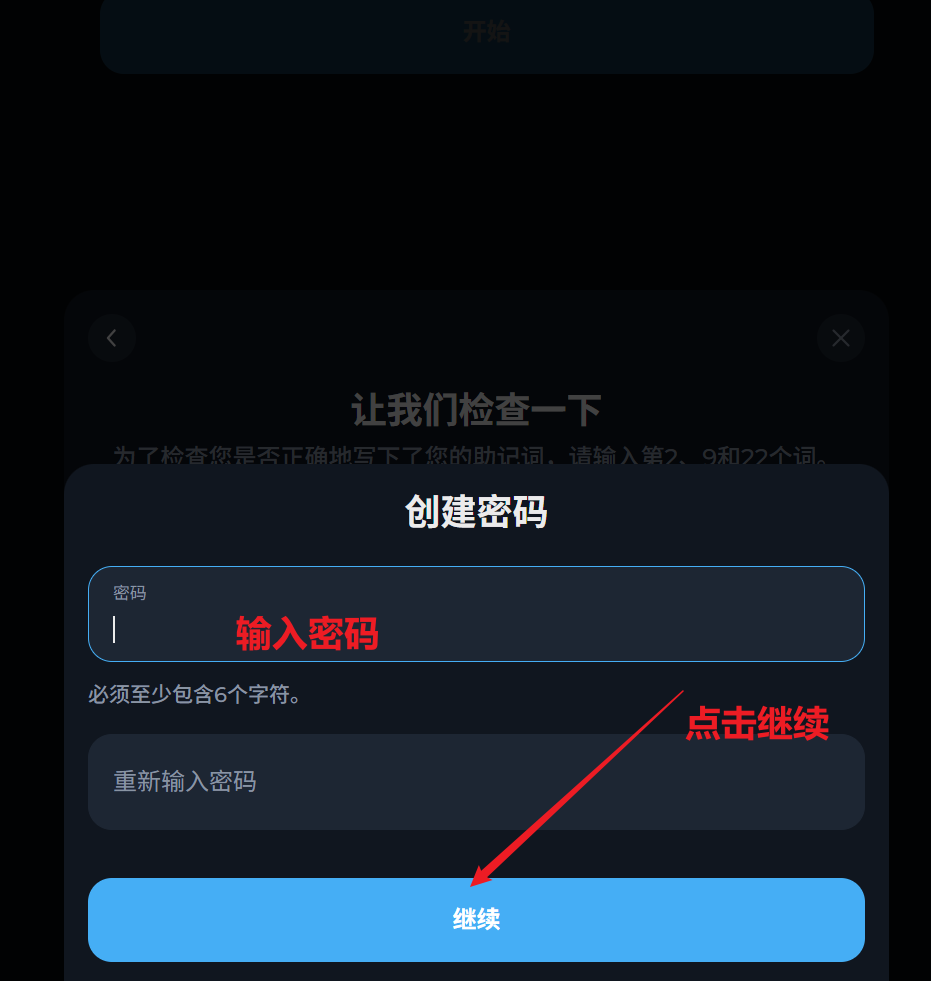 助记词完成后,创建一个钱包密码。该密码是在你每次支付确认的时候需要输入的