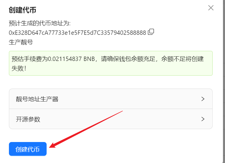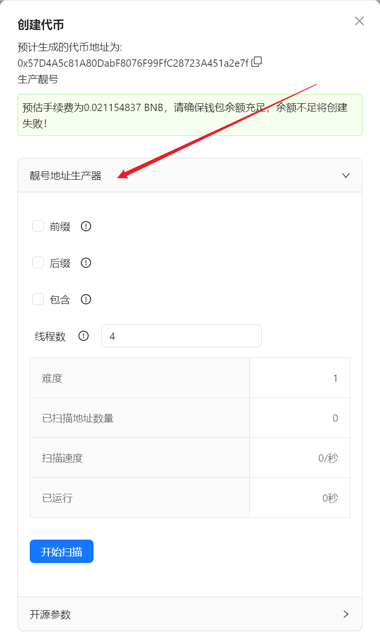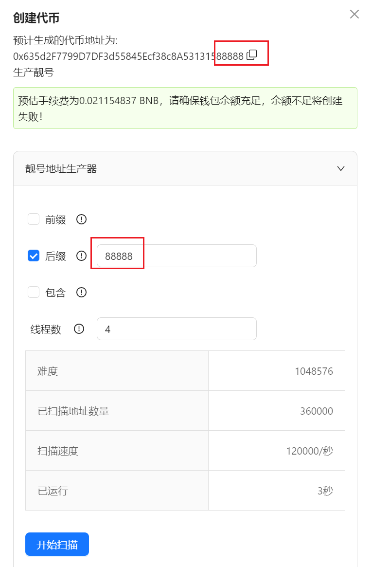 批量工具生成靓号工具On this page生成靓号工具 靓号代币视频教程: 1、填写完代币参数后,点击创建代币 2、点击靓号地址生成器 参数说明 前缀 : 生成的靓号地址的开头号码 后缀 : 生成的靓号地址的尾部号码 包含 : 生成的靓号地址中包含的号码 线程数 : 开启多线程后,使用设备性能越好,生成速度越快, 3、填写你需要的靓号,点击开始扫描 4、完成后,点击创建代币