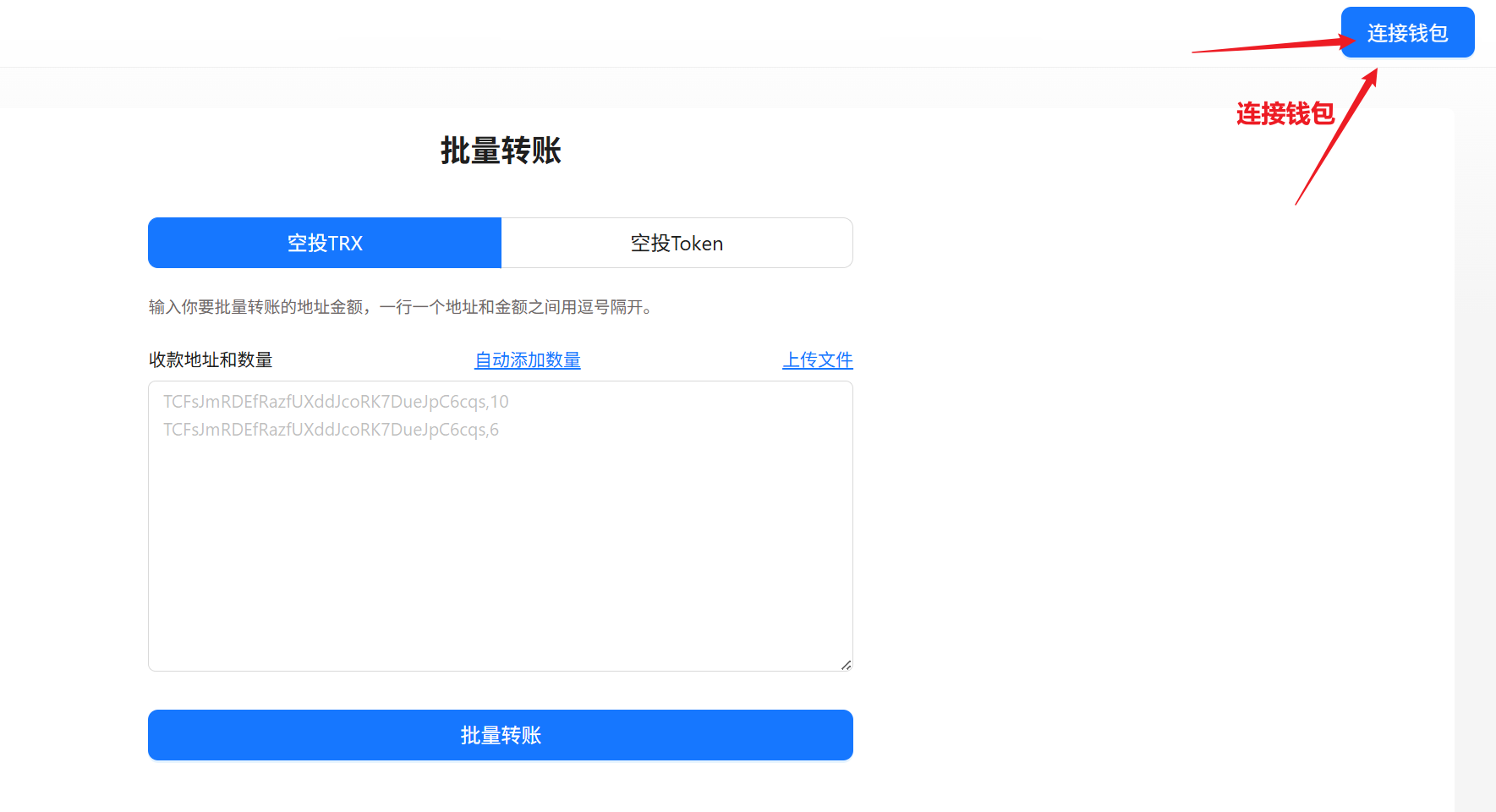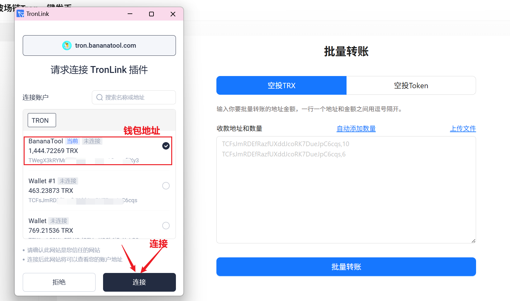 我们打开波场批量转账工具的链接:https://tron.bananatool.org/airdrop ,点击右上角连接钱包。(请先确保自己的浏览器已经安装了波宝钱包,如果没有,请查阅 → TronLink波宝钱包安装教程)