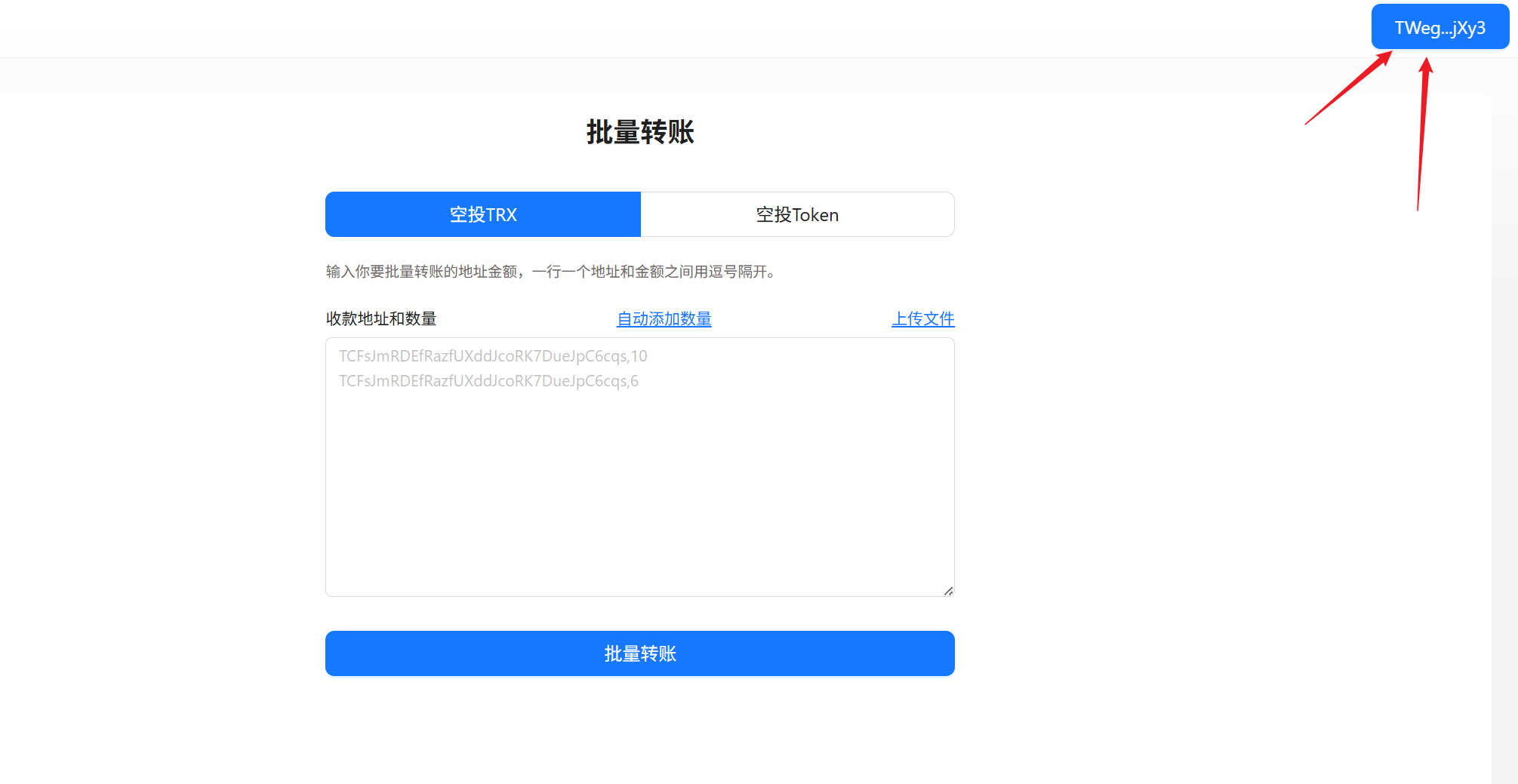 {% hint style="info" %} 波场链批量转账需要消耗能量,尤其是 USDT 这类合约代币,能量消耗极高。操作前建议提前购买足够能量。购买地址:https://feee.io/?ic=Z5U7 {% endhint %}