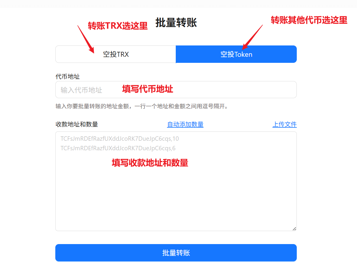 接下来,我们需要填写转账信息,包括:转账的代币、转账的地址以及每个地址的接收数量