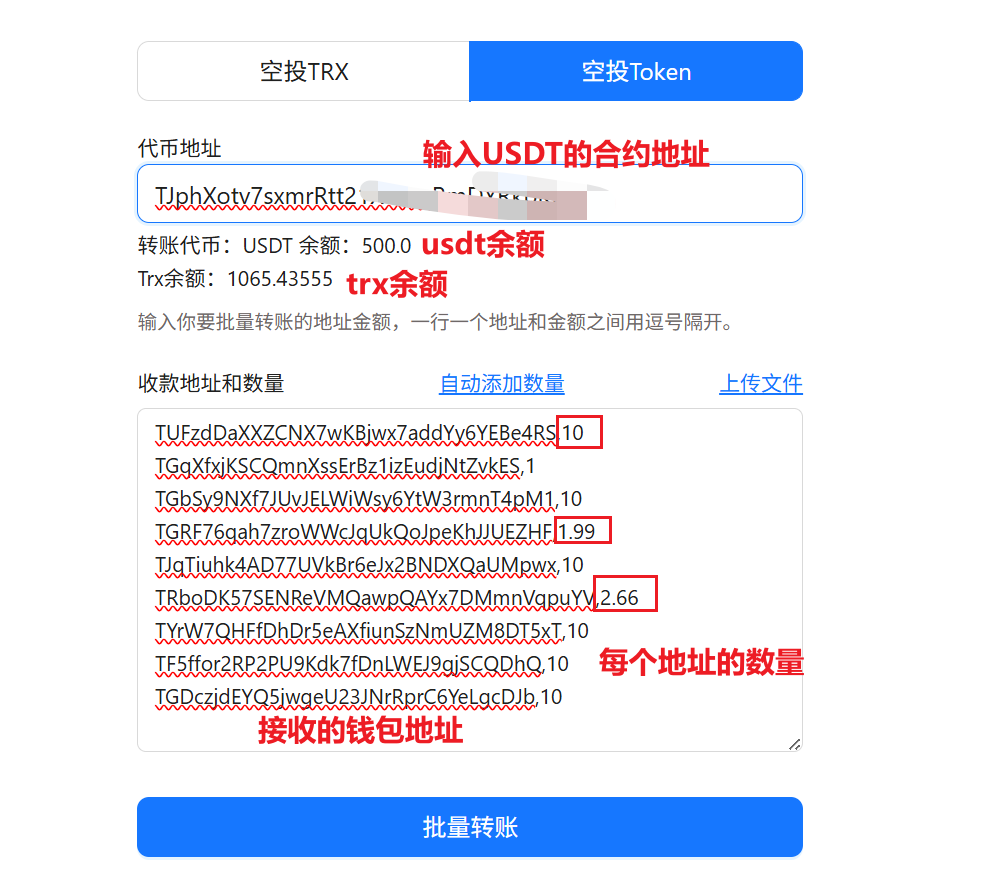 例如,我要转账USDT给到10个钱包地址,每个钱包不固定数量,填写后就是下图的样子