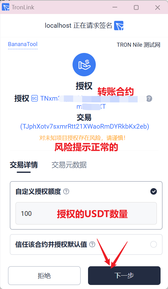 这里我们需要填写自己要授权的USDT数量,或者不用自定义,直接选择默认值也可以。但不管如何,都要保证填写的数量要大于此次转账的数量。
