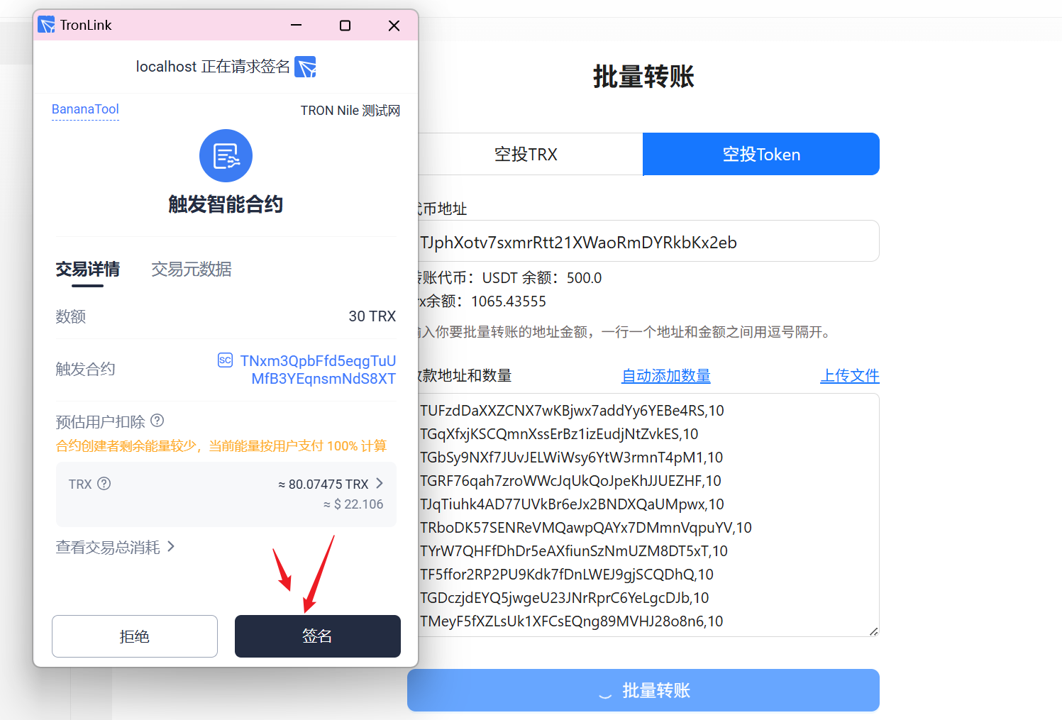 授权确认完成后,钱包再次弹出,点击签名,即可完成批量转账