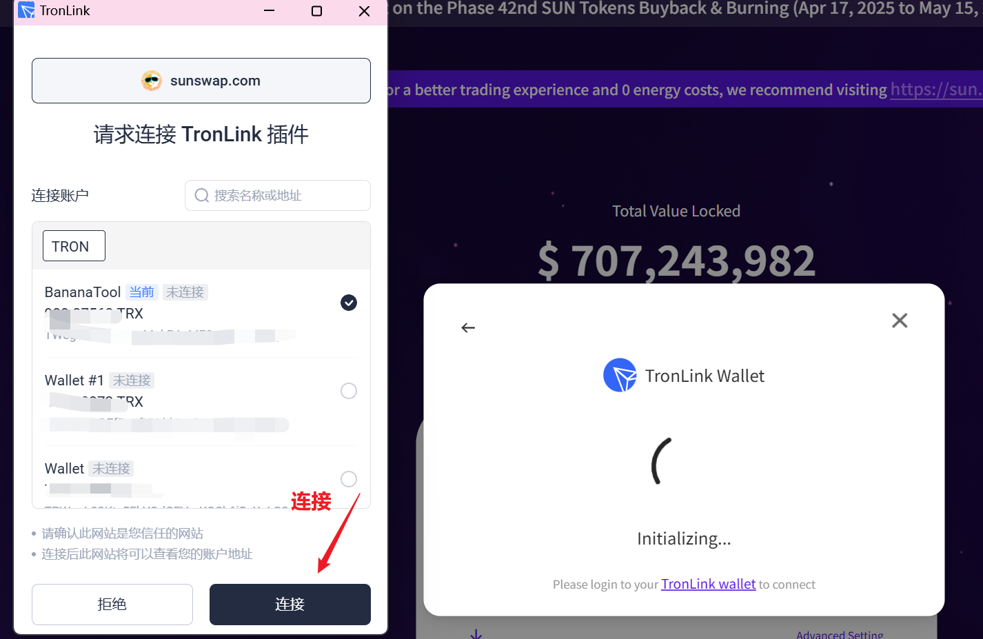 选择 TronLink 后,浏览器会弹出钱包授权窗口。勾选要连接的钱包地址并点击“连接”。