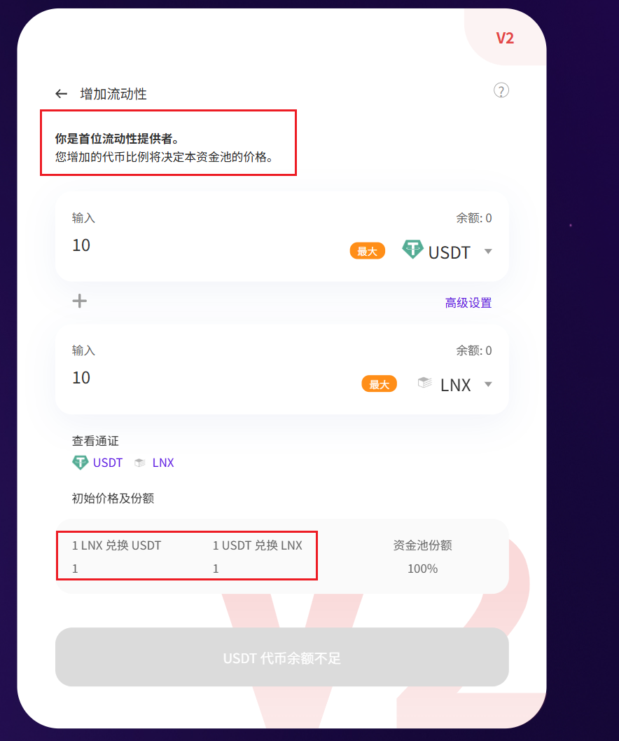 💡 价格参考:如果你提供了 10 USDT 和 10 个代币,则系统会自动设定代币价格为 1 USDT。