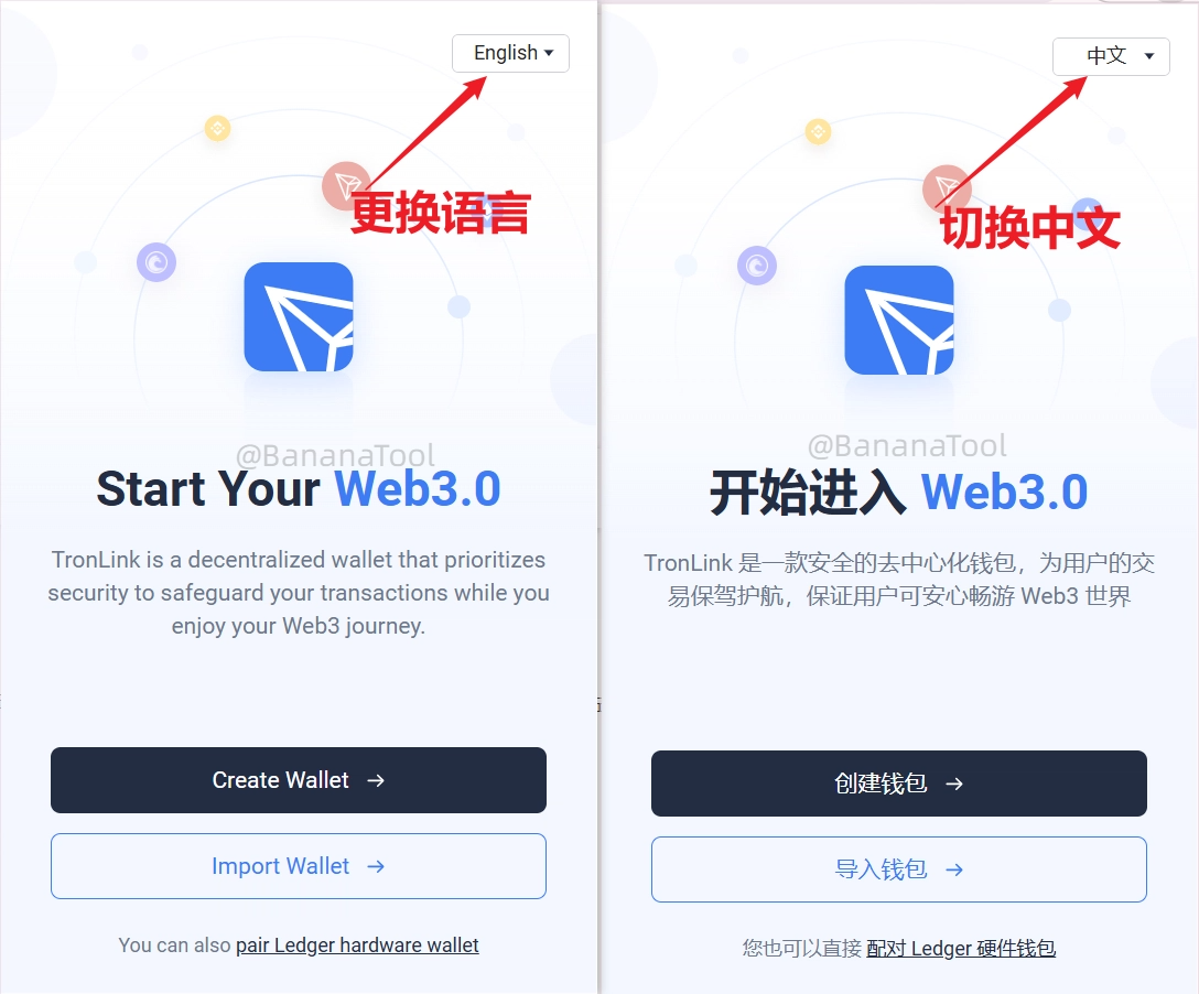 之后,我们就有两种操作方式了:创建钱包或者导入钱包,这两个流程BananaTool将分别和大家说一下